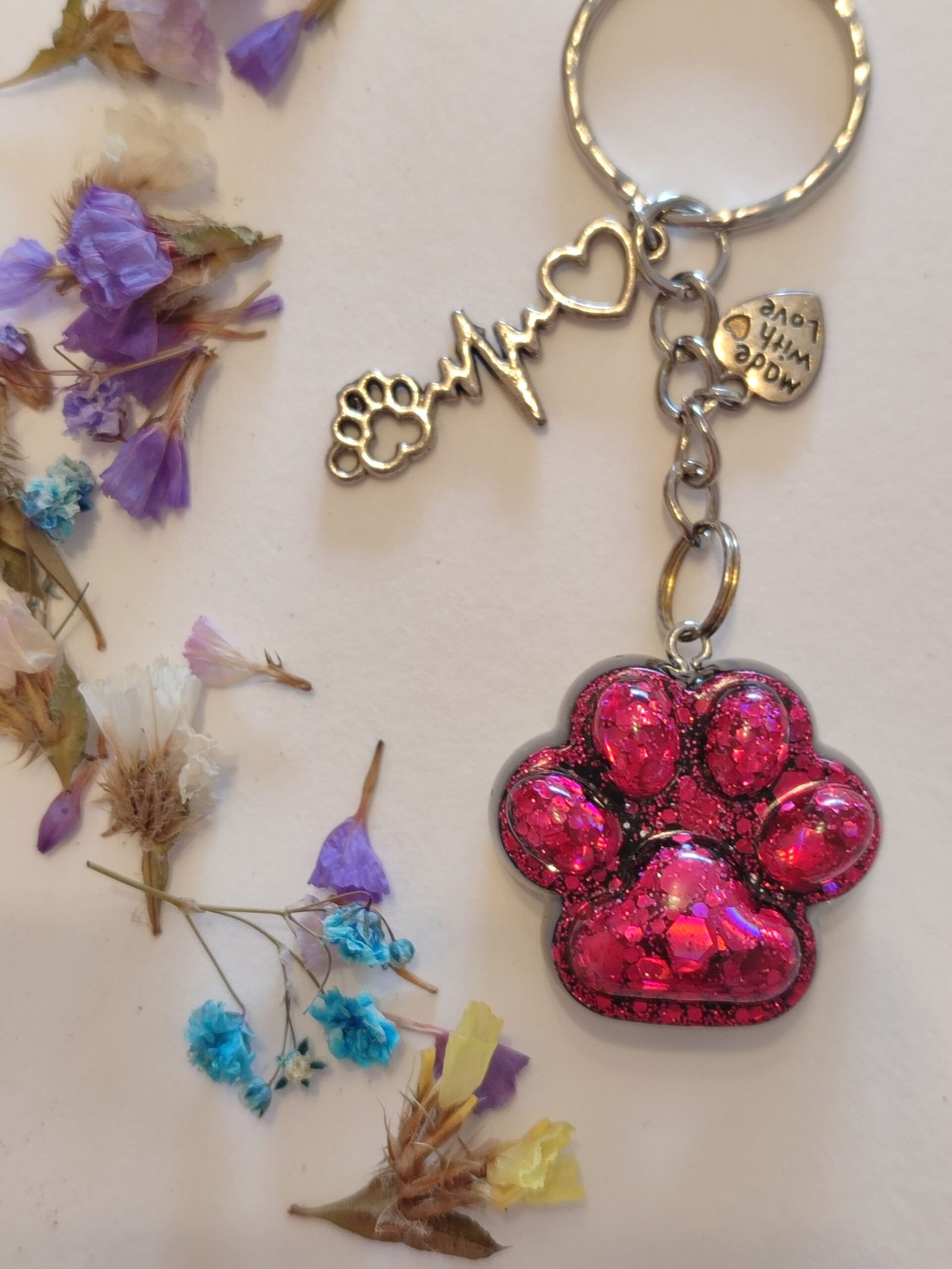 Llavero con forma de HUELLITA de perro/gato hecho con RESINA EPOXI y purpurina ROSA FUCSIA sobre fondo negro.