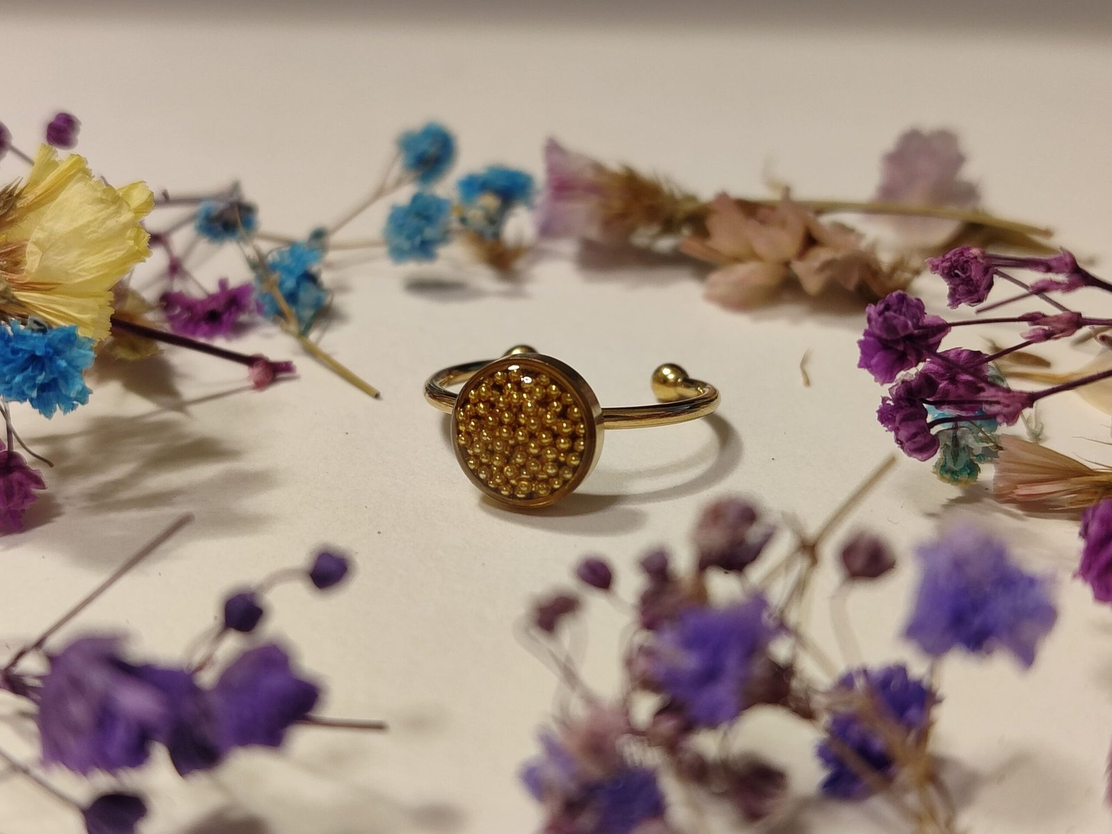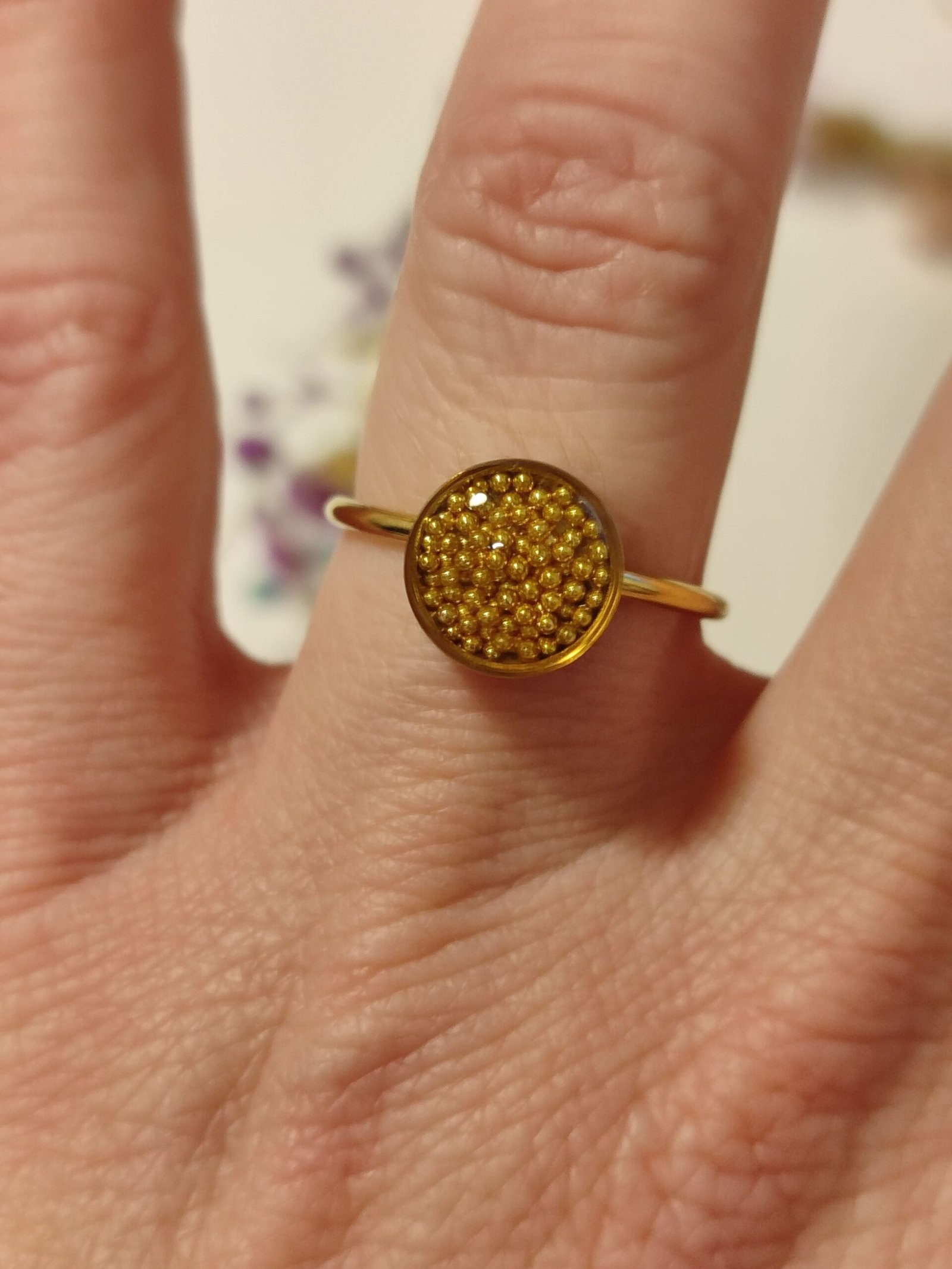 Anillo ajustable de acero inoxidable con BOLITAS DORADAS encapsuladas en resina.