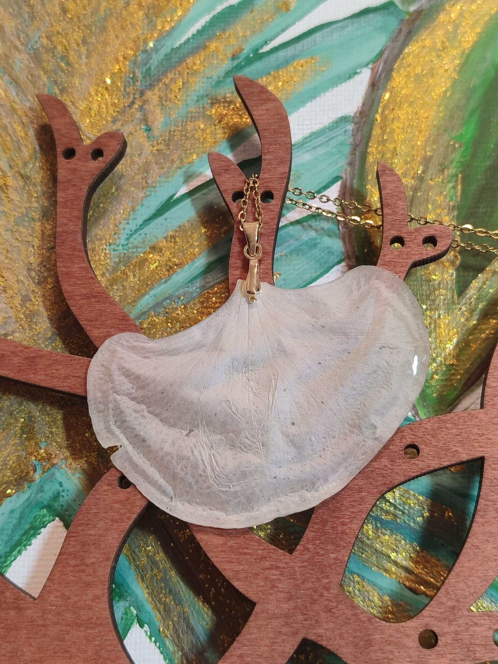 Colgante con un PÉTALO DE ORQUÍDEA BLANCA encapsulado en resina. Aplique y cadena de acero inoxidable.