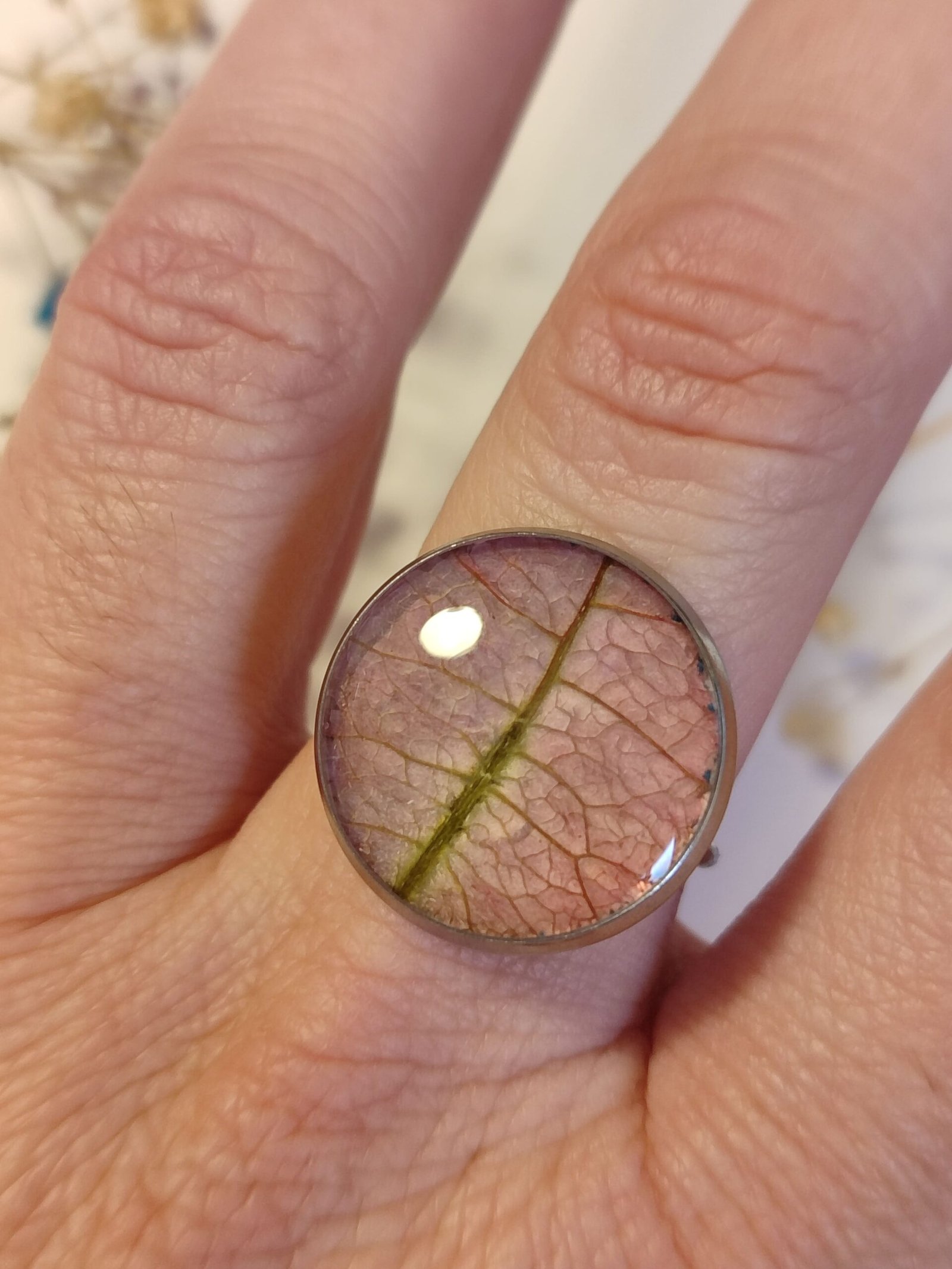Anillo con base ajustable con UN PÉTALO DE BUGANVILLA encapsulado en resina.