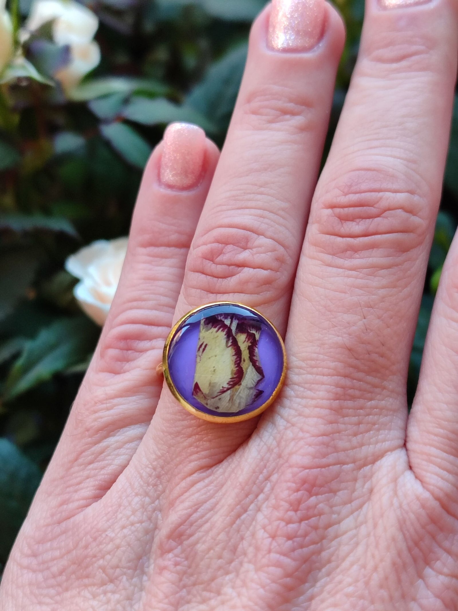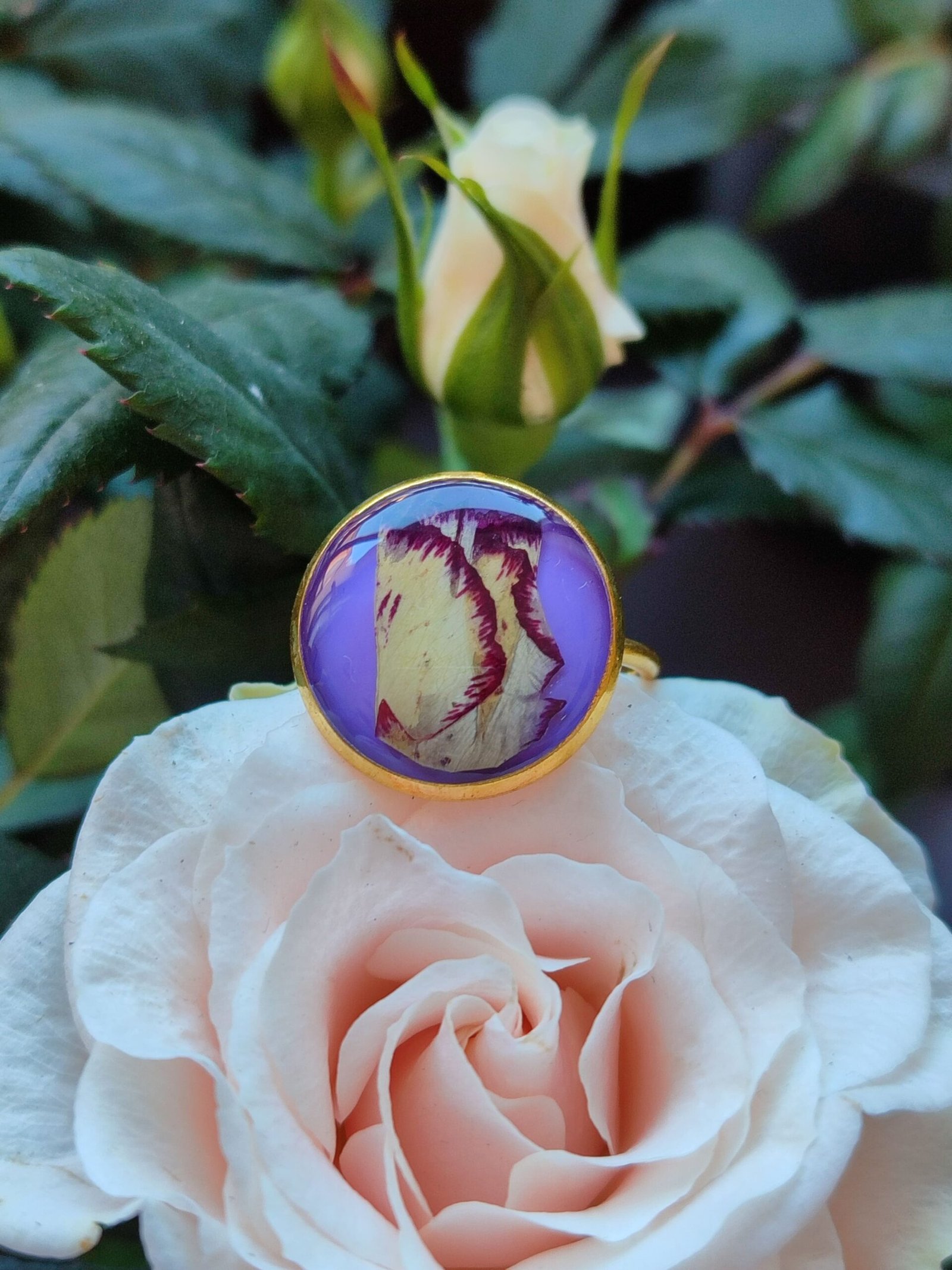 Anillo con base ajustable DORADA con UN PÉTALO DE CLAVEL BICOLOR encapsulado en resina.