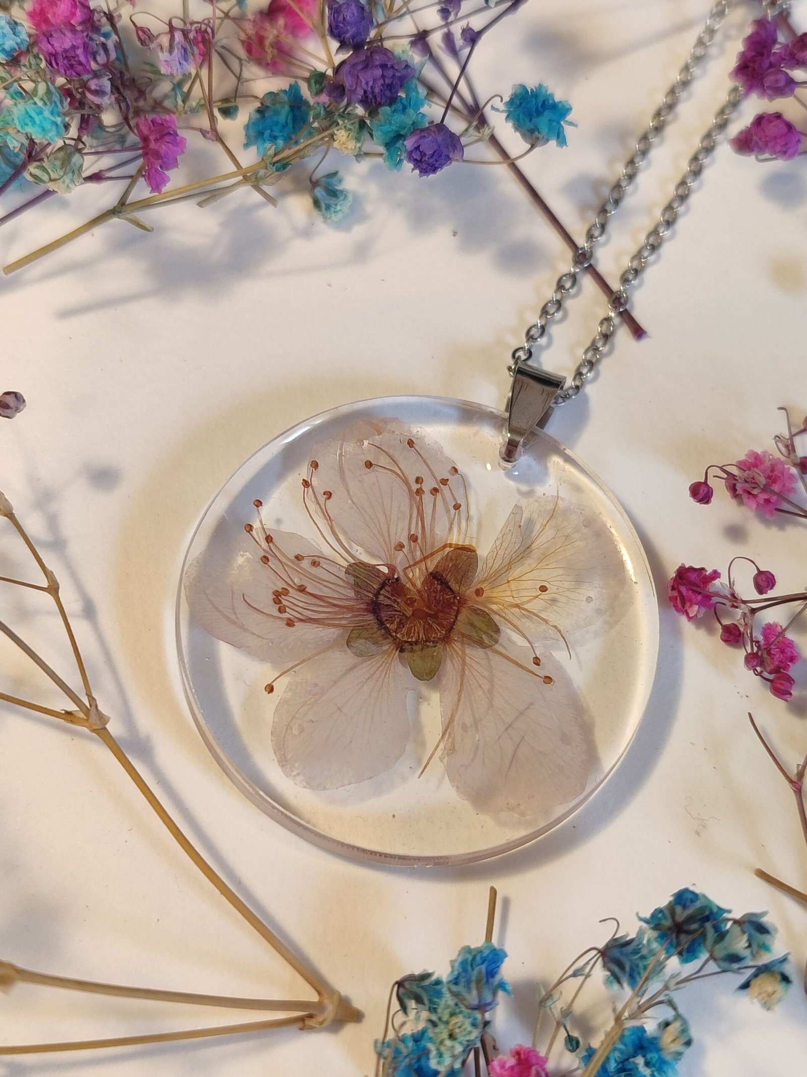 COLGANTE con UNA FLOR DE CEREZO encapsulada en resina.