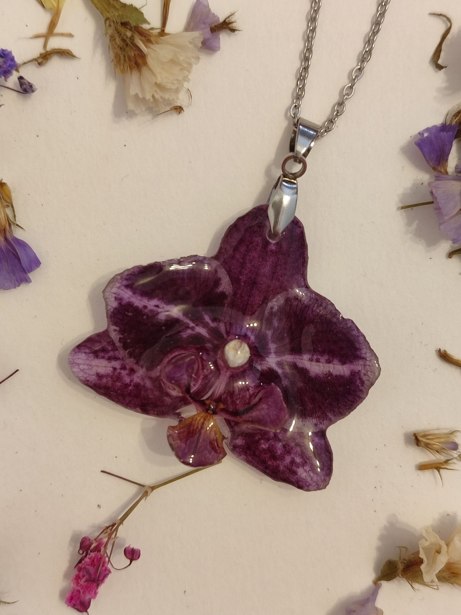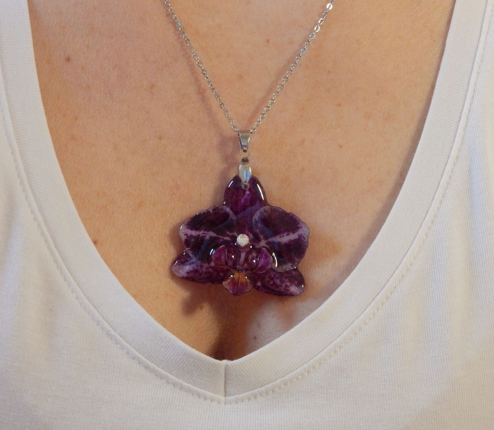 Colgante con una ORQUÍDEA REAL encapsulada en resina. Aplique y cadena de acero inoxidable.
