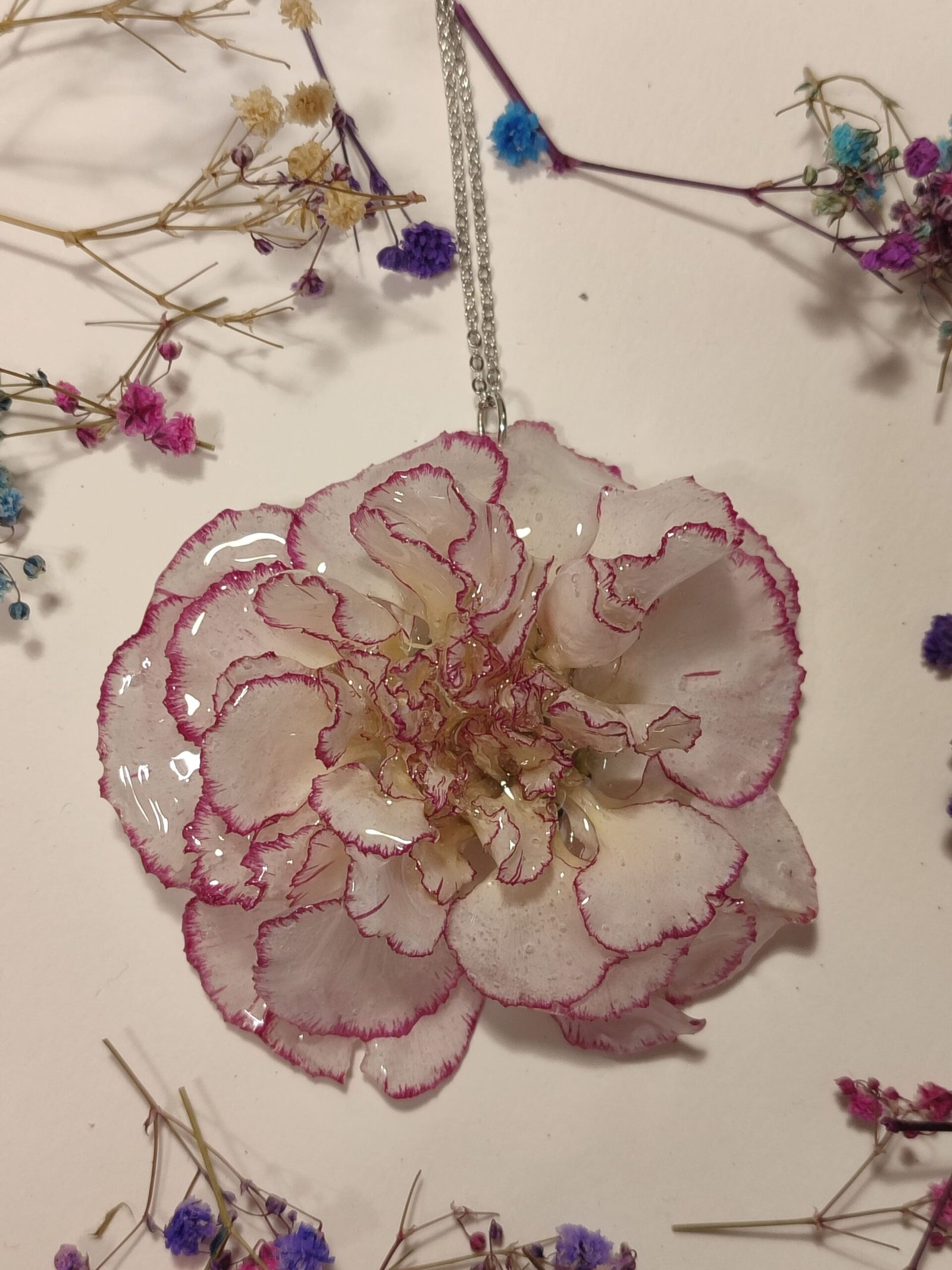 COLGANTE con UN CLAVEL BICOLOR COMPLETO encapsulado en resina.