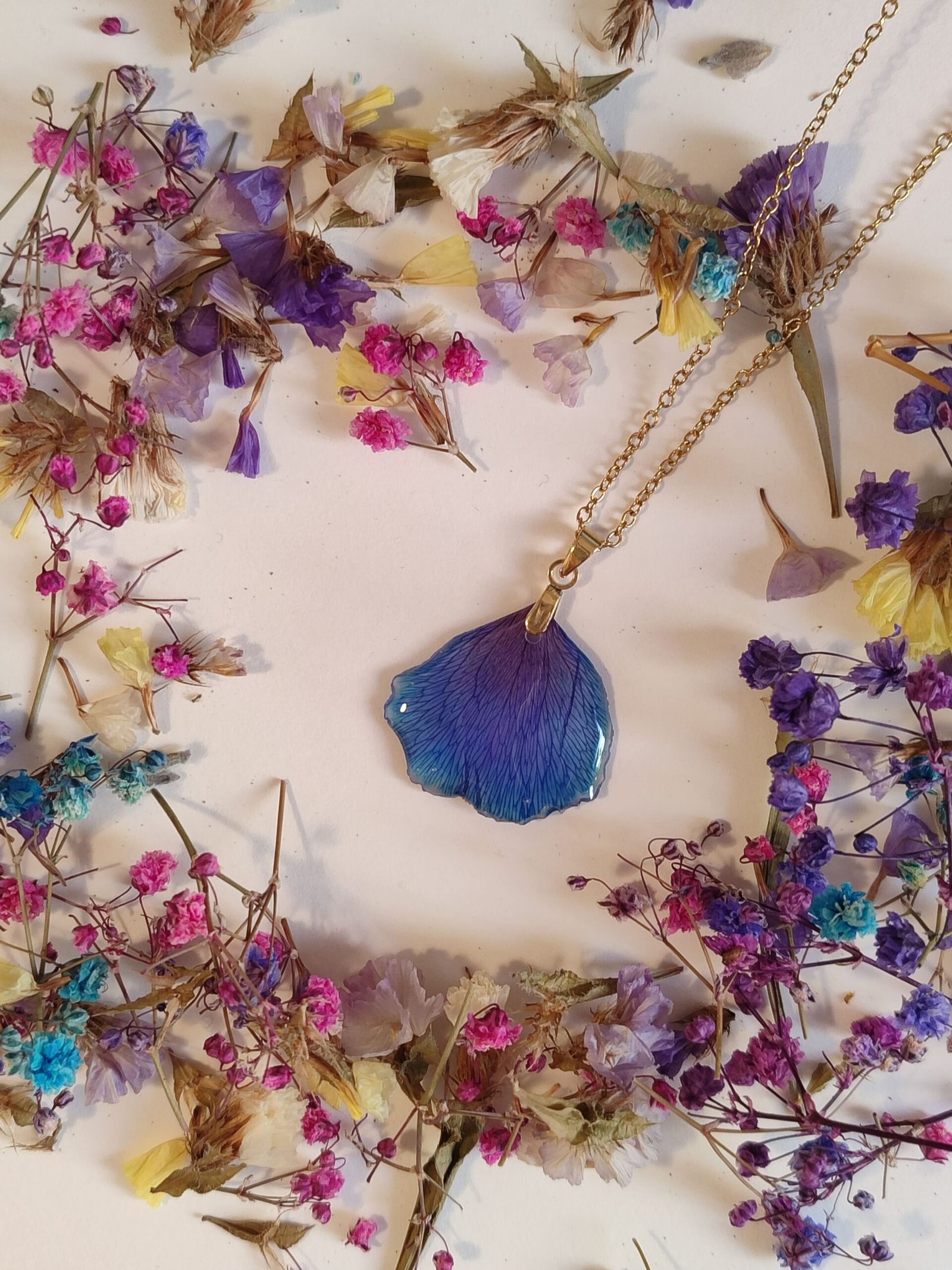 • Uso acero inoxidable en mis creaciones para evitar posibles alergias, no para que las piezas sean mojadas. La resina y las flores no se llevan bien con el agua, así que has de evitar ducharte con ellas. Por descontado, si vas a la playa a la piscina, mejor deja tus florecitas en casa.