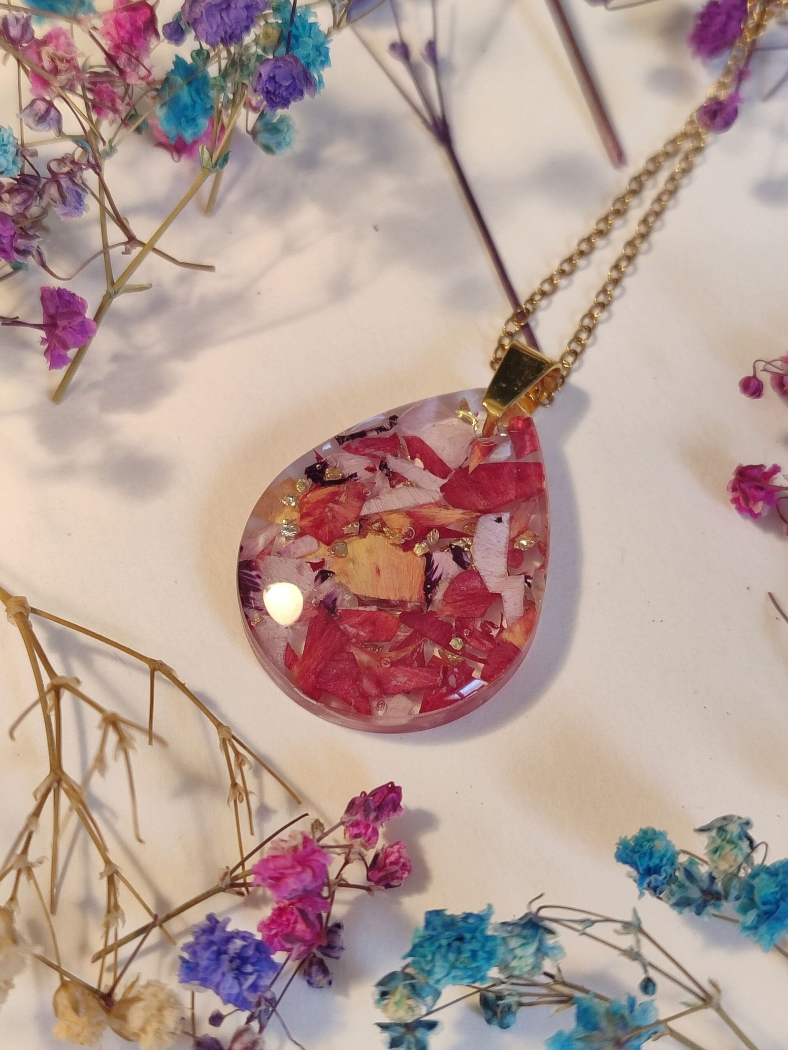 - Uso acero inoxidable en mis creaciones para evitar posibles alergias, no para que las piezas sean mojadas. La resina y las flores no se llevan bien con el agua, así que has de evitar ducharte con ellas. Por descontado, si vas a la playa a la piscina, mejor deja tus florecitas en casa.