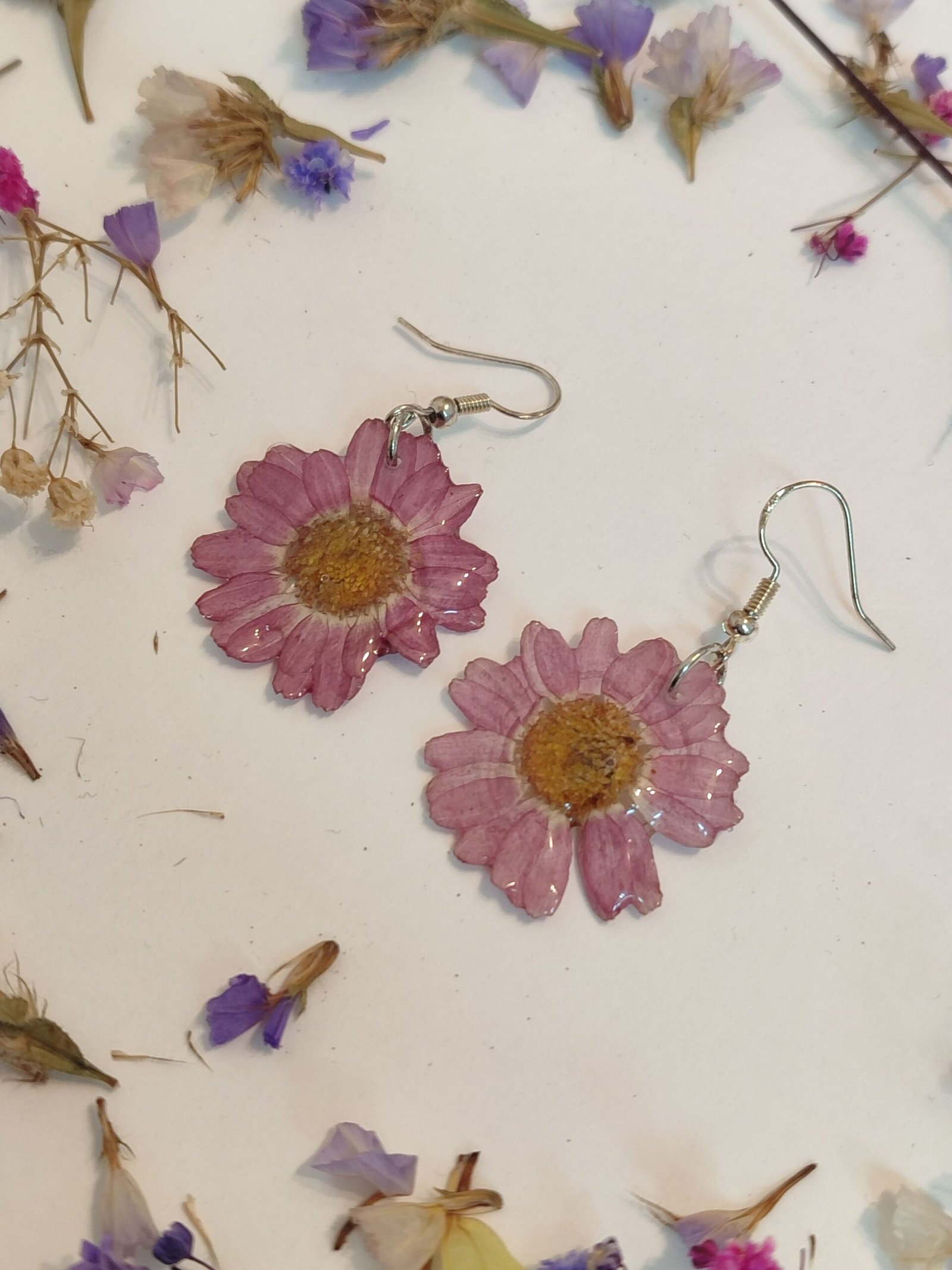 Pendientes con UNOS CRISANTEMOS encapsulados en resina.