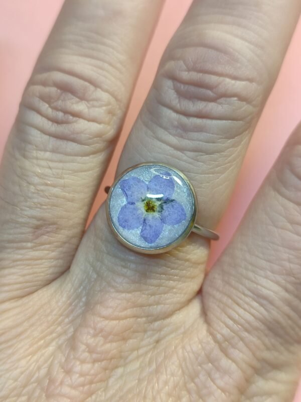Anillo con base plateada ajustable y de acero inoxidable con FLOR DE NO ME OLVIDES.