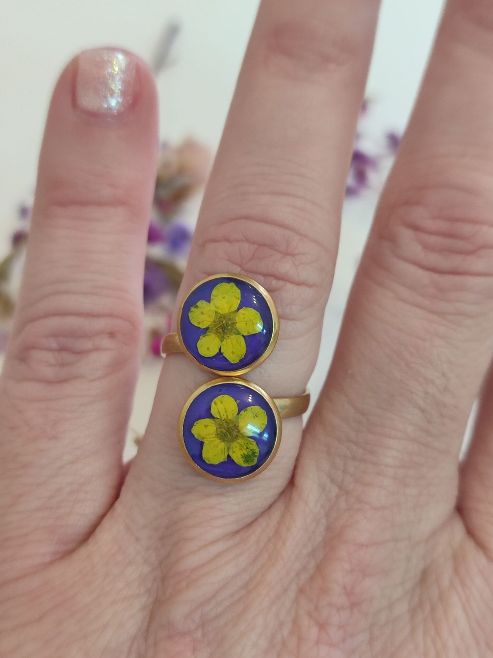 Anillo con base ajustable con FLORES AMARILLAS encapsuladas en resina.