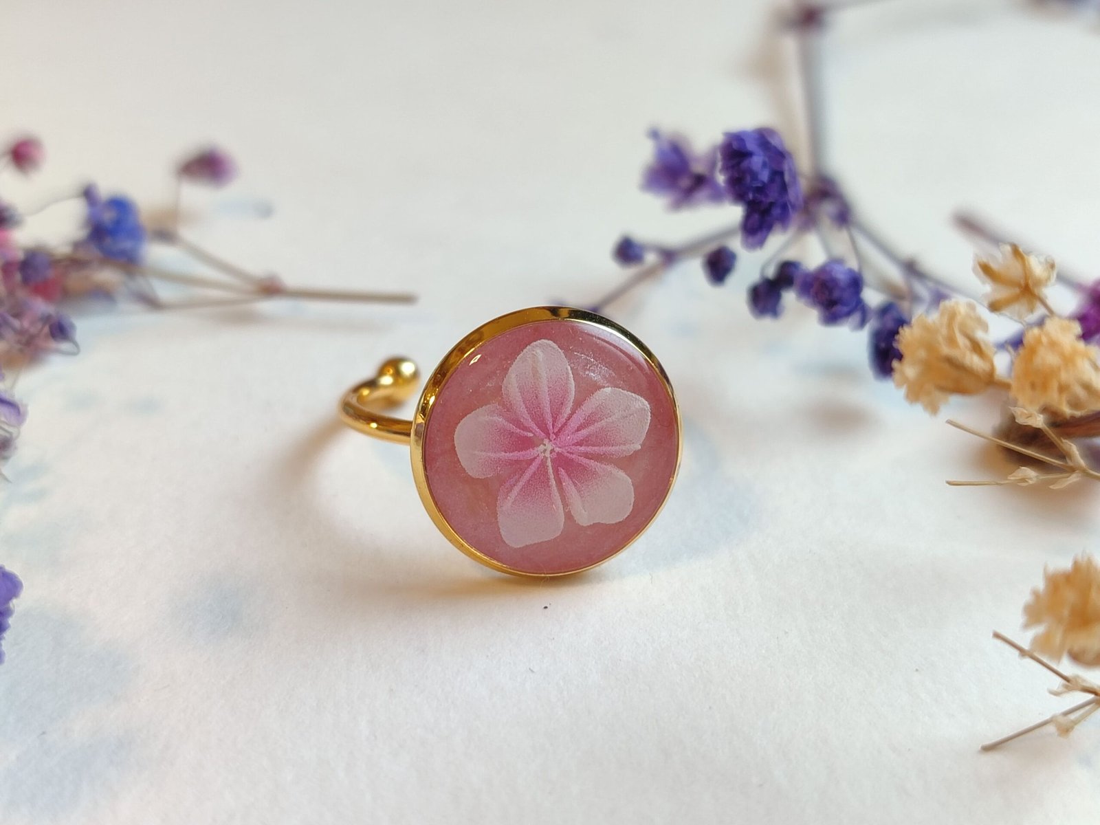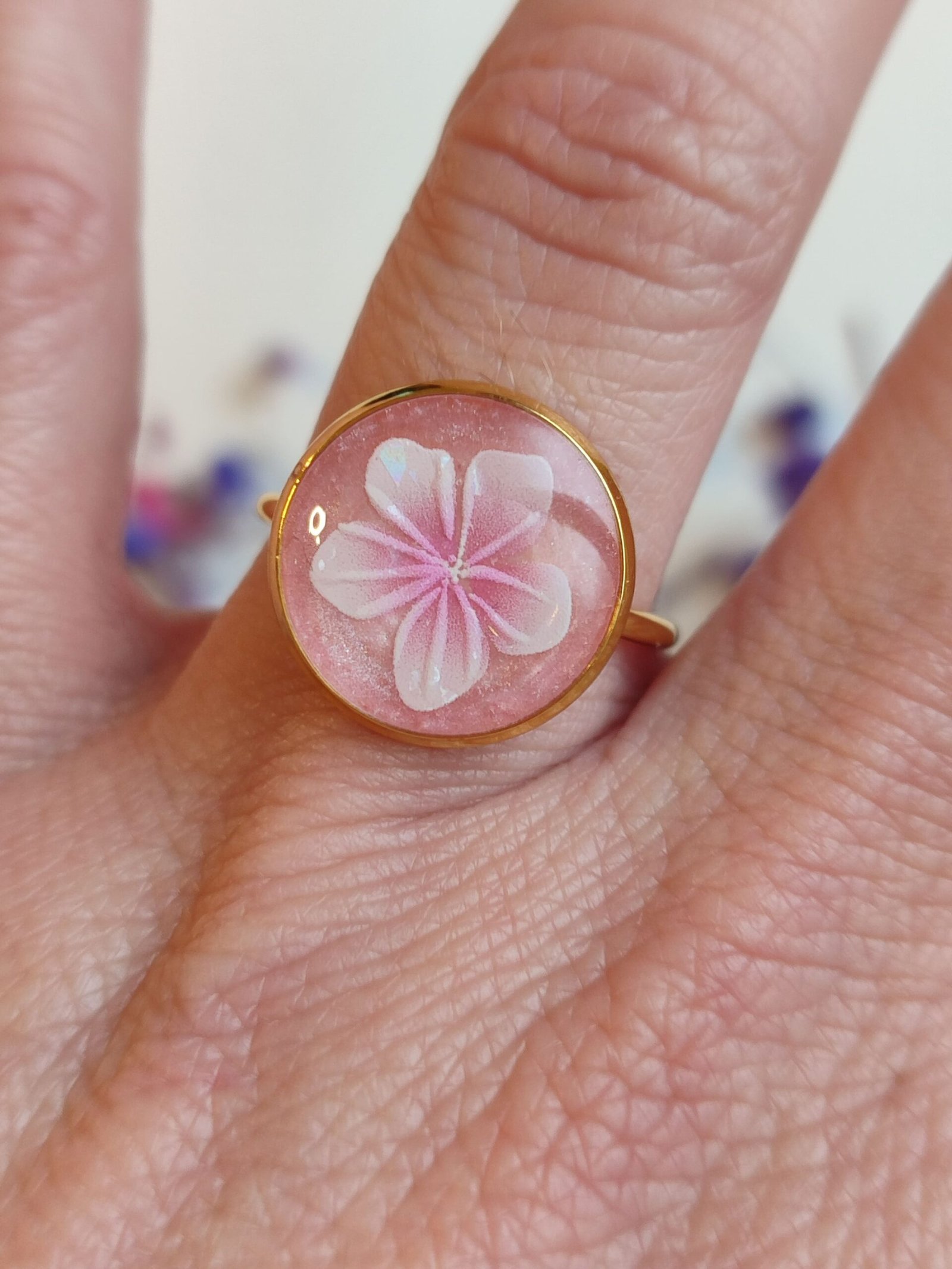 ANILLO con una FLOR BLANCA (pegatina) SOBRE FONDO NACARADO y encapsulada en resina.
