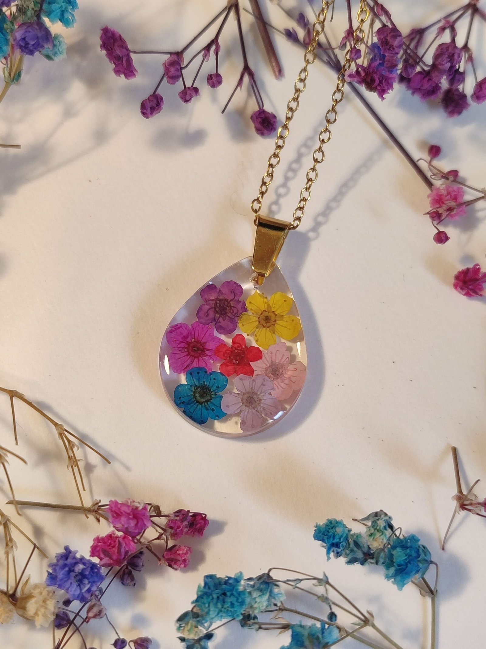 - Uso acero inoxidable en mis creaciones para evitar posibles alergias, no para que las piezas sean mojadas. La resina y las flores no se llevan bien con el agua, así que has de evitar ducharte con ellas. Por descontado, si vas a la playa a la piscina, mejor deja tus florecitas en casa.
