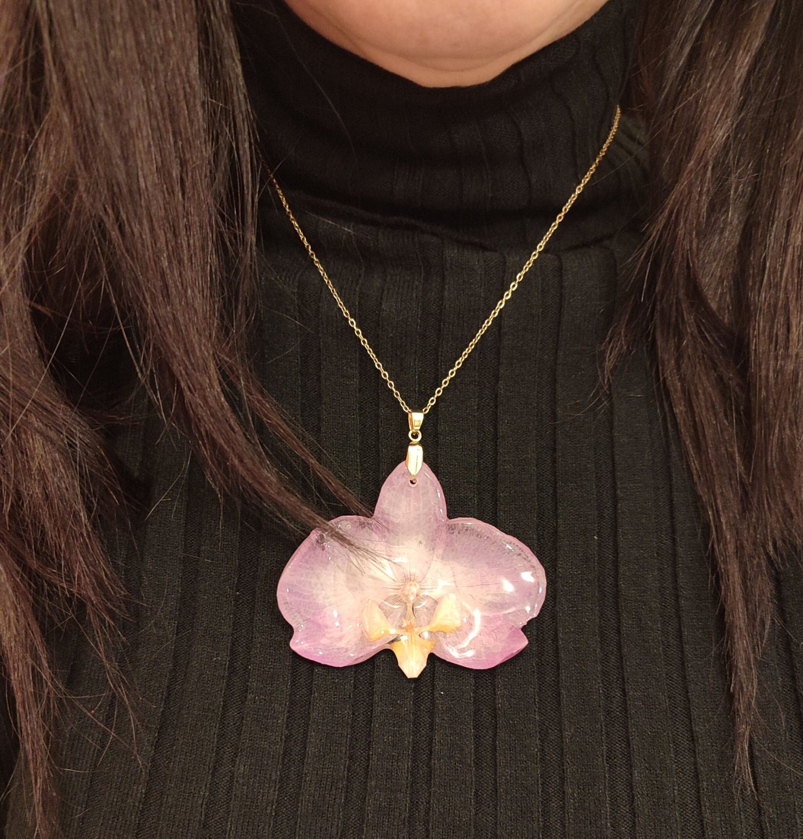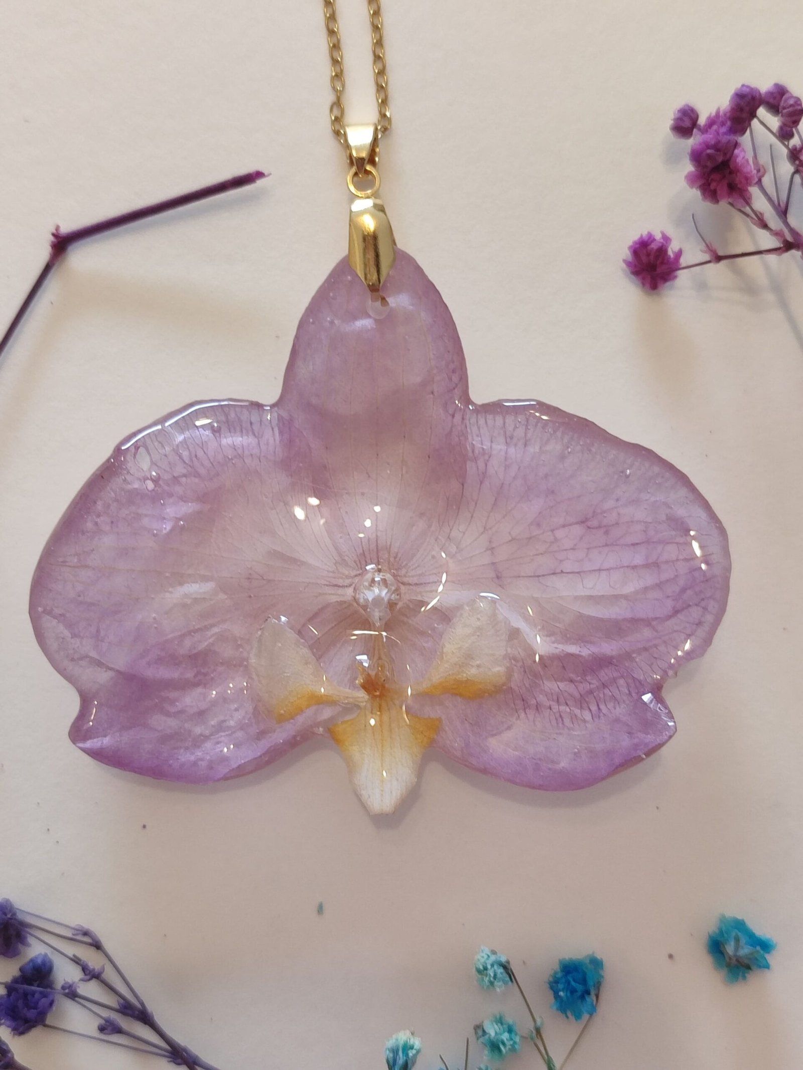 Colgante con una ORQUÍDEA REAL encapsulada en resina. Aplique y cadena de acero inoxidable.