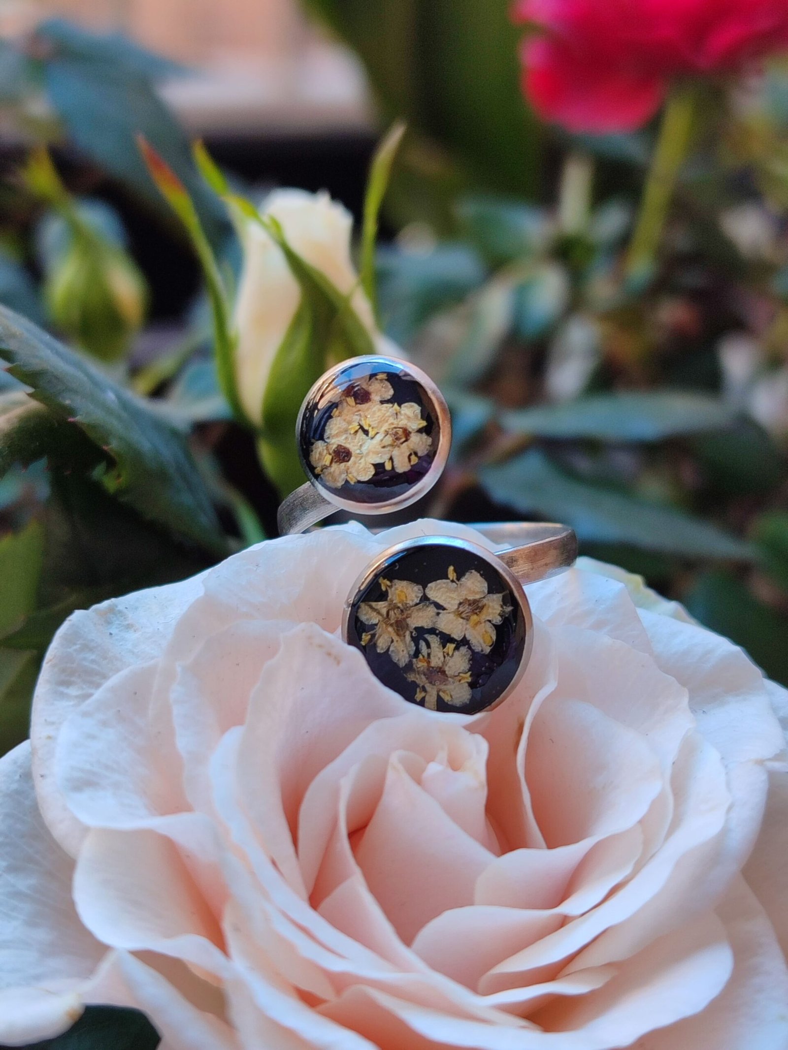 - Uso acero inoxidable en mis creaciones para evitar posibles alergias, no para que las piezas sean mojadas. La resina y las flores no se llevan bien con el agua, así que has de evitar ducharte con ellas. Por descontado, si vas a la playa a la piscina, mejor deja tus florecitas en casa.