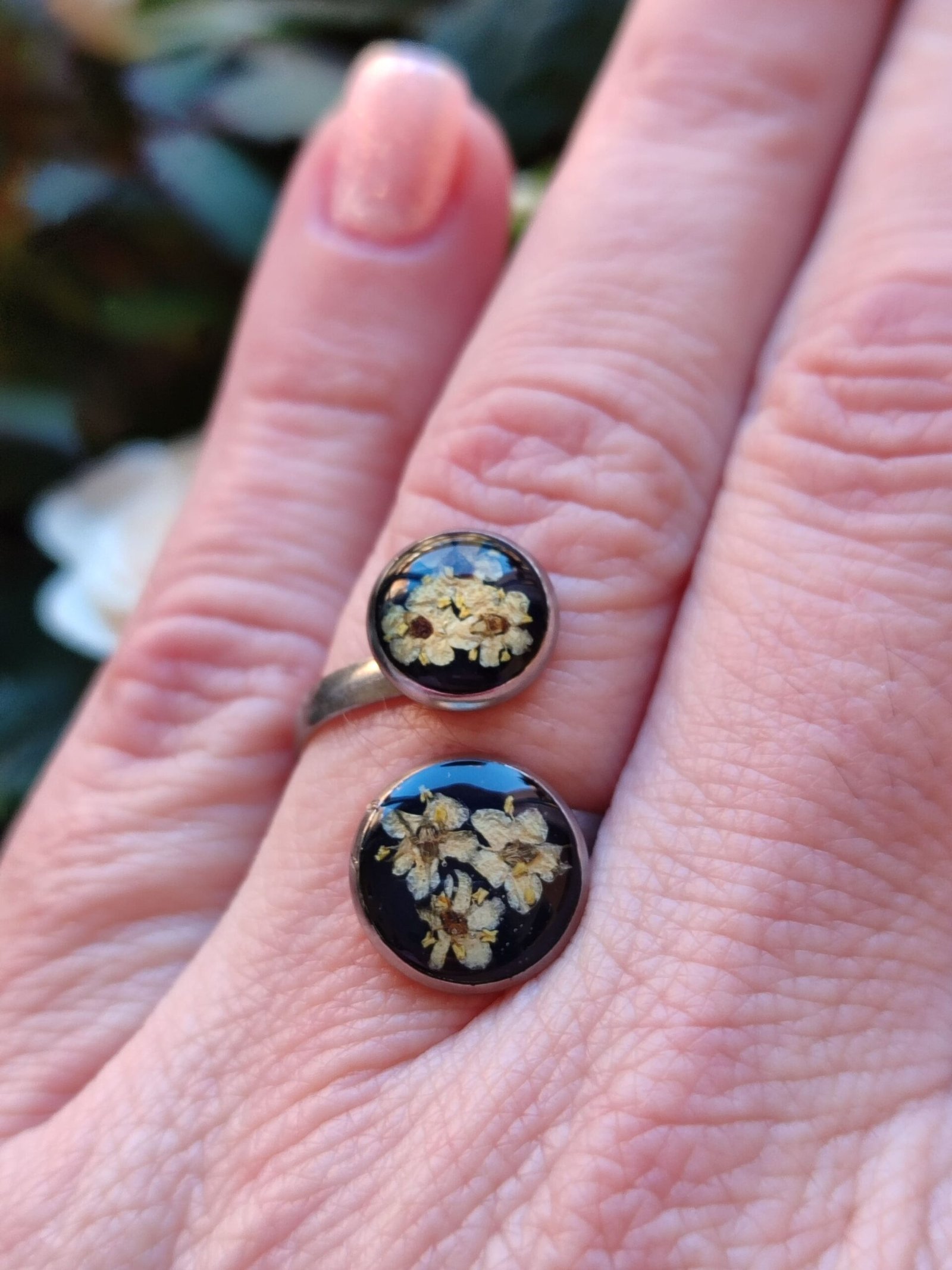Anillo con base ajustable PLATEADA con FLORES DE SAÚCO encapsuladas en resina.