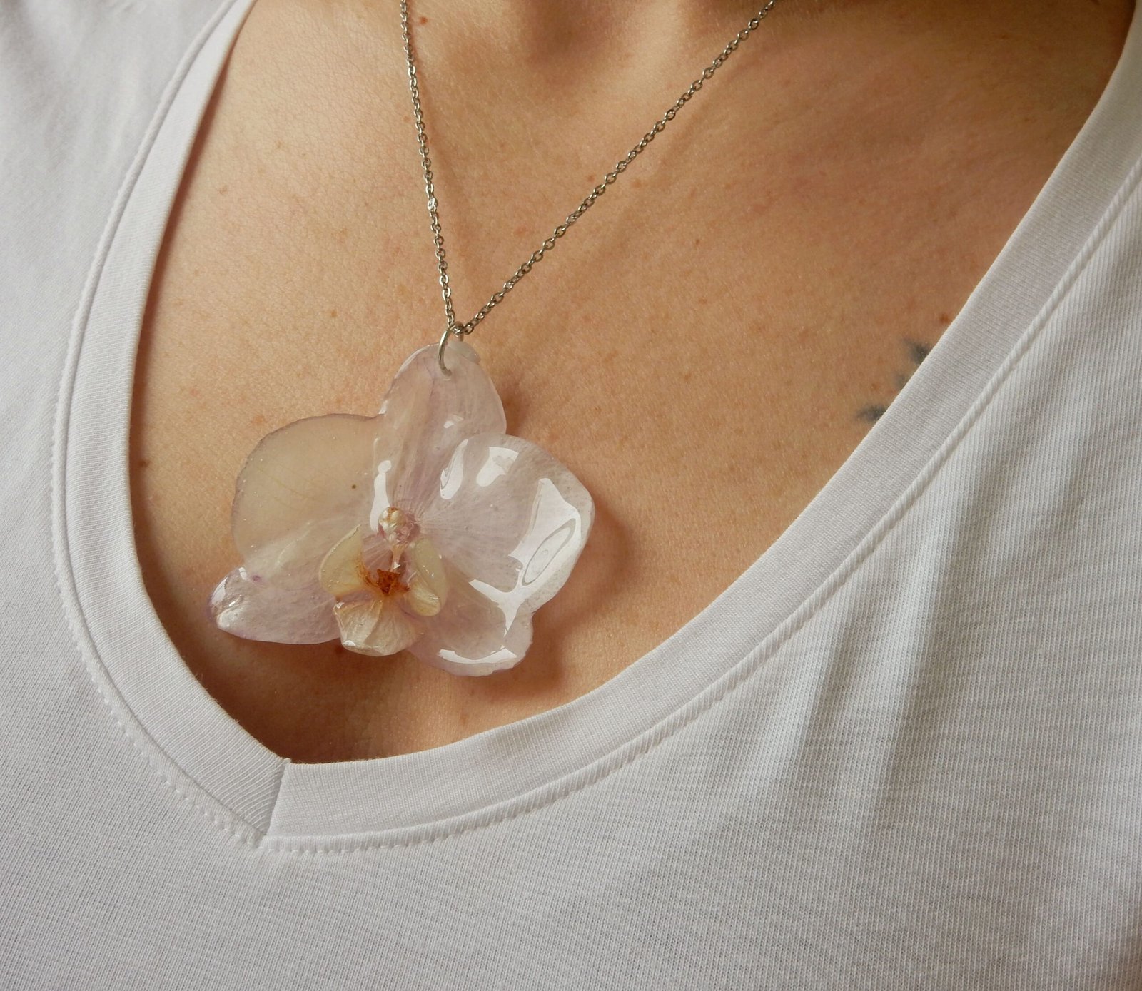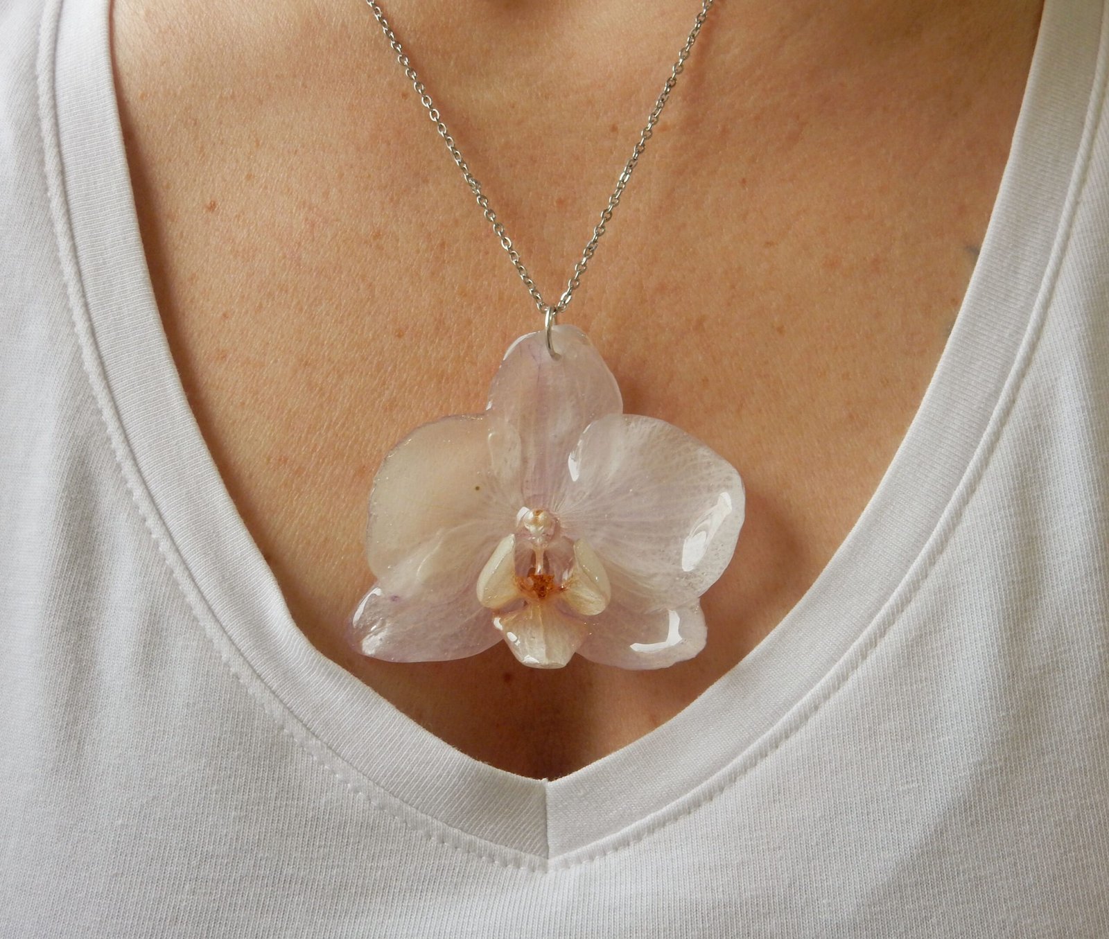 Colgante con una ORQUÍDEA REAL encapsulada en resina. Aplique y cadena de acero inoxidable.