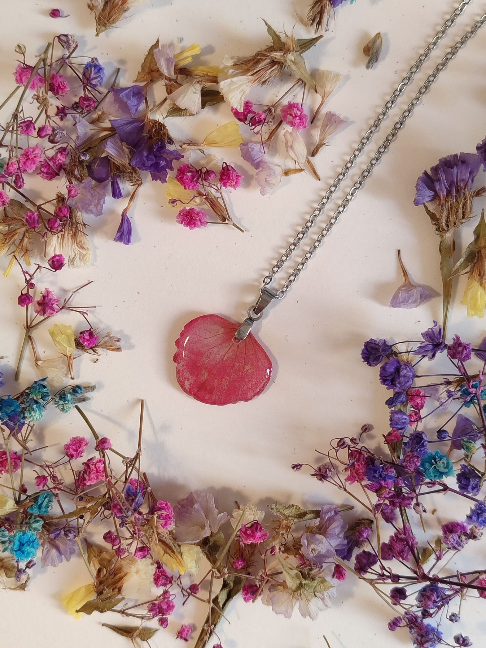 • Uso acero inoxidable en mis creaciones para evitar posibles alergias, no para que las piezas sean mojadas. La resina y las flores no se llevan bien con el agua, así que has de evitar ducharte con ellas. Por descontado, si vas a la playa a la piscina, mejor deja tus florecitas en casa.