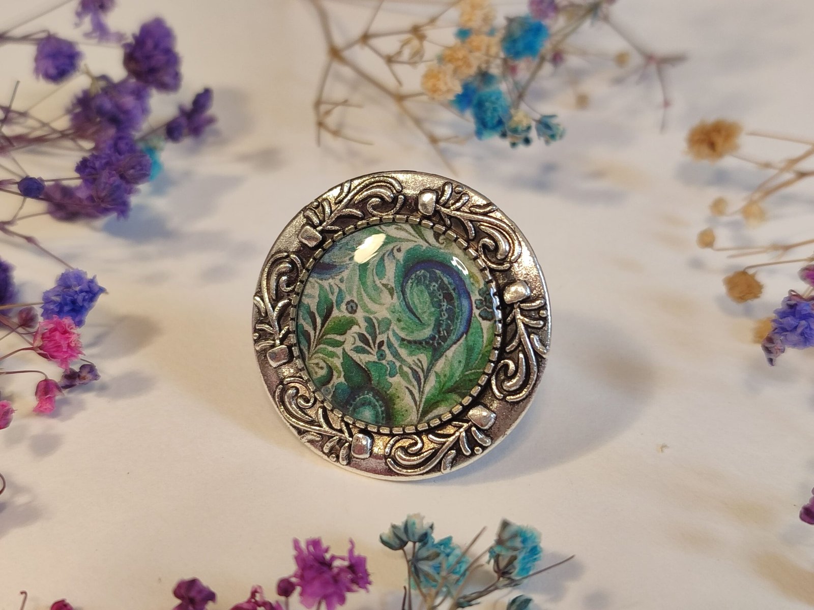 Anillo con base ajustable con UN PRINT CON ESTAMPADO JAQUARD encapsulado en resina.