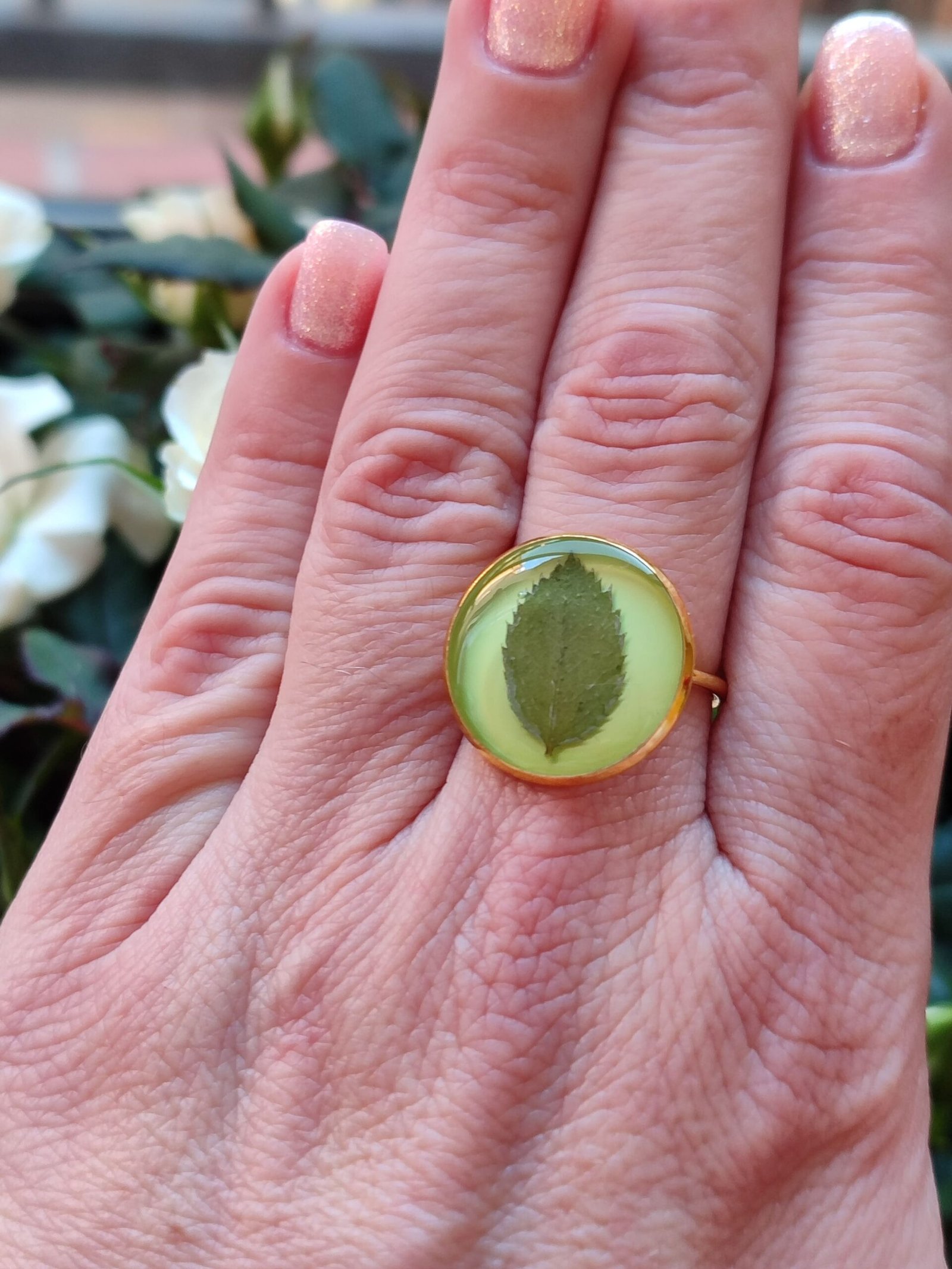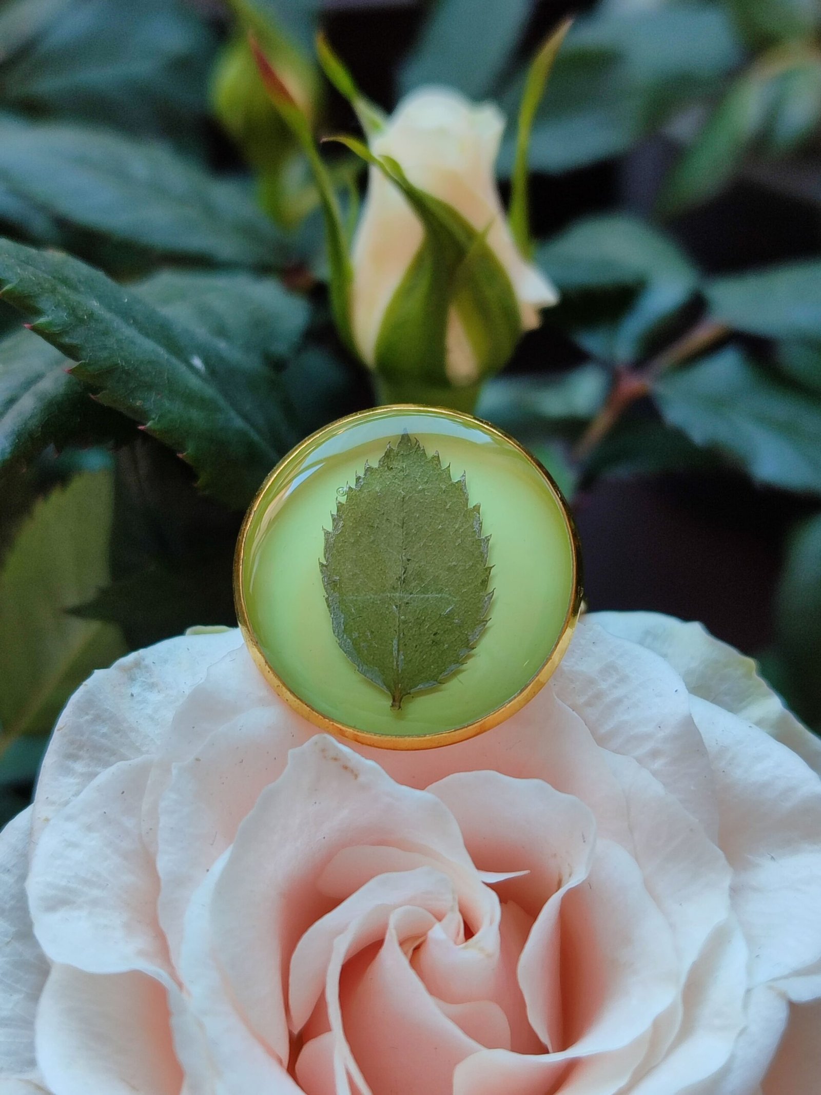 Anillo con base ajustable DORADA con UNA HOJA DE ROSAL encapsulada en resina.