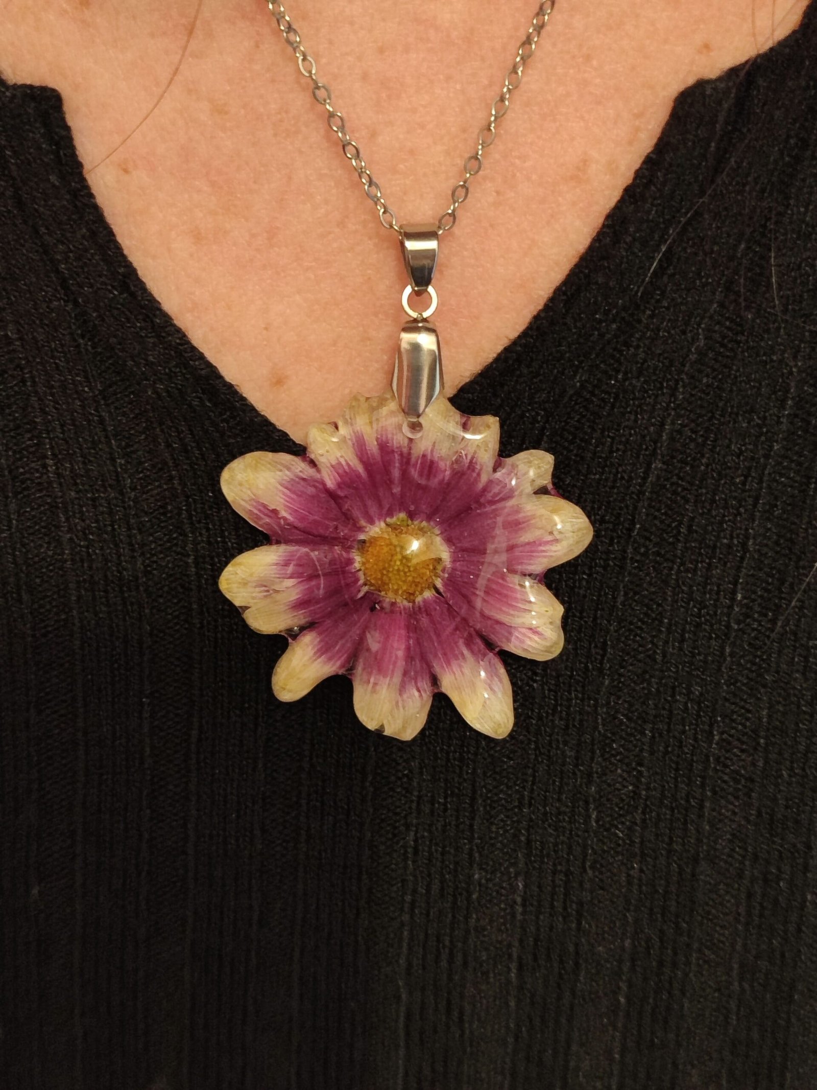 Colgante con un CRISANTEMO encapsulado en resina. Aplique y cadena de acero inoxidable.