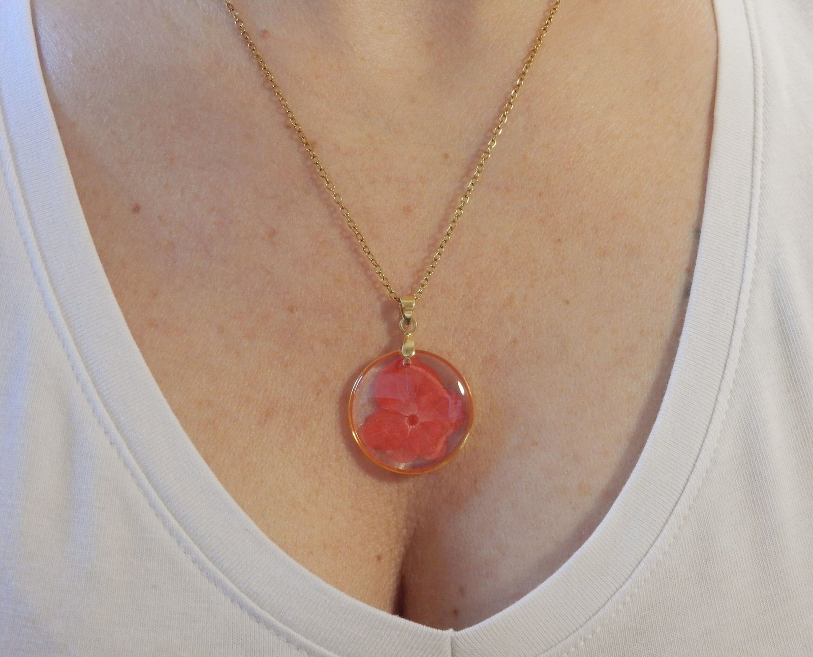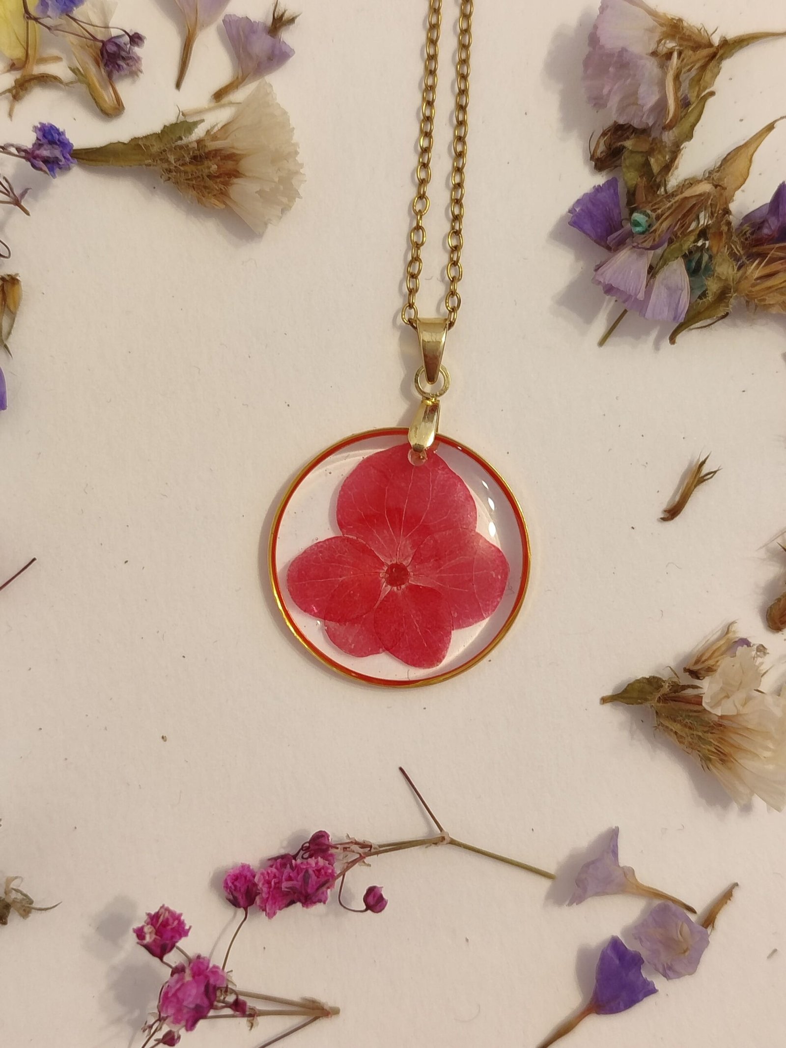 Colgante con una flor de HORTENSIA ROJA encapsulada en resina. Aplique y cadena de acero inoxidable.