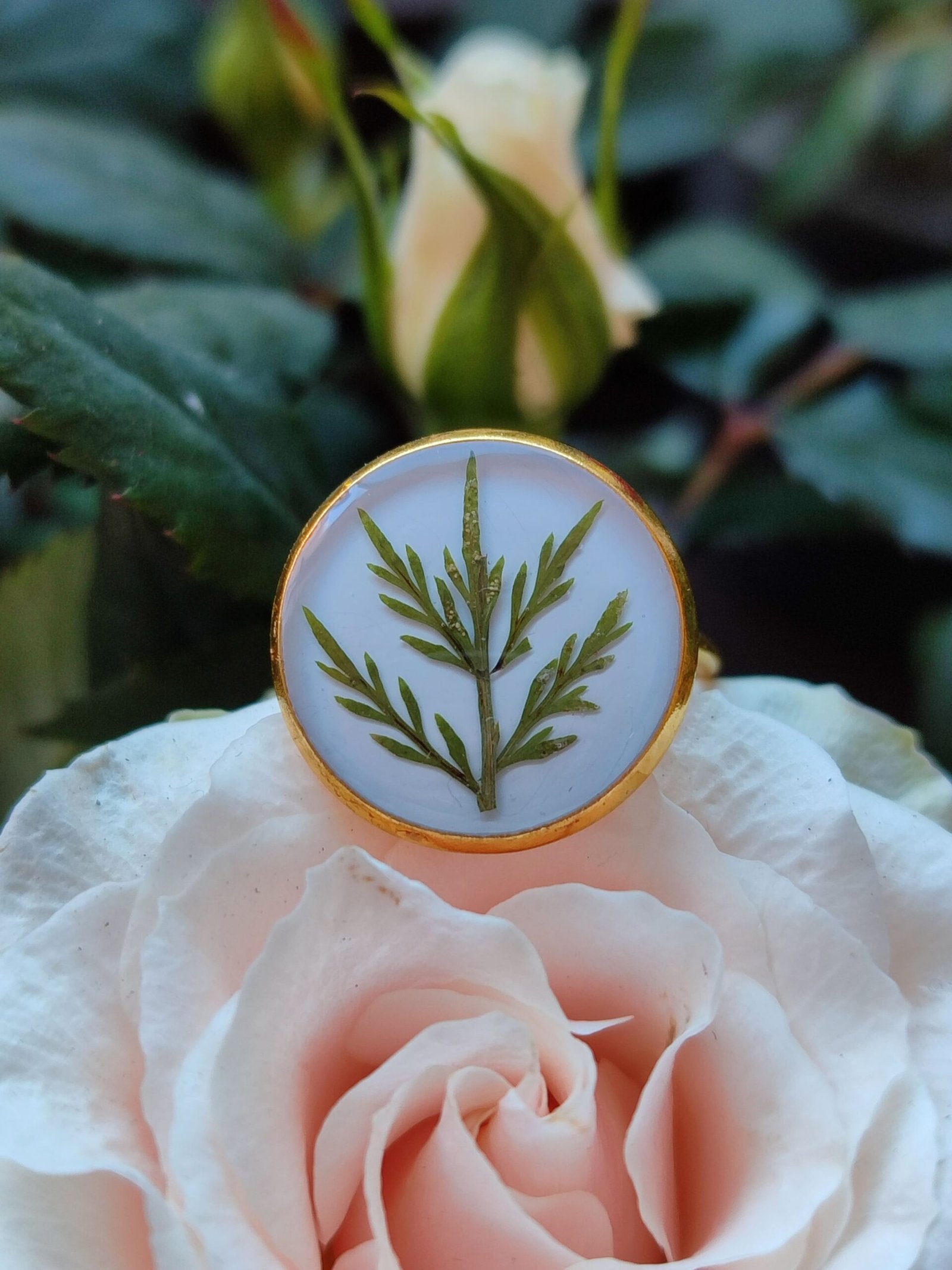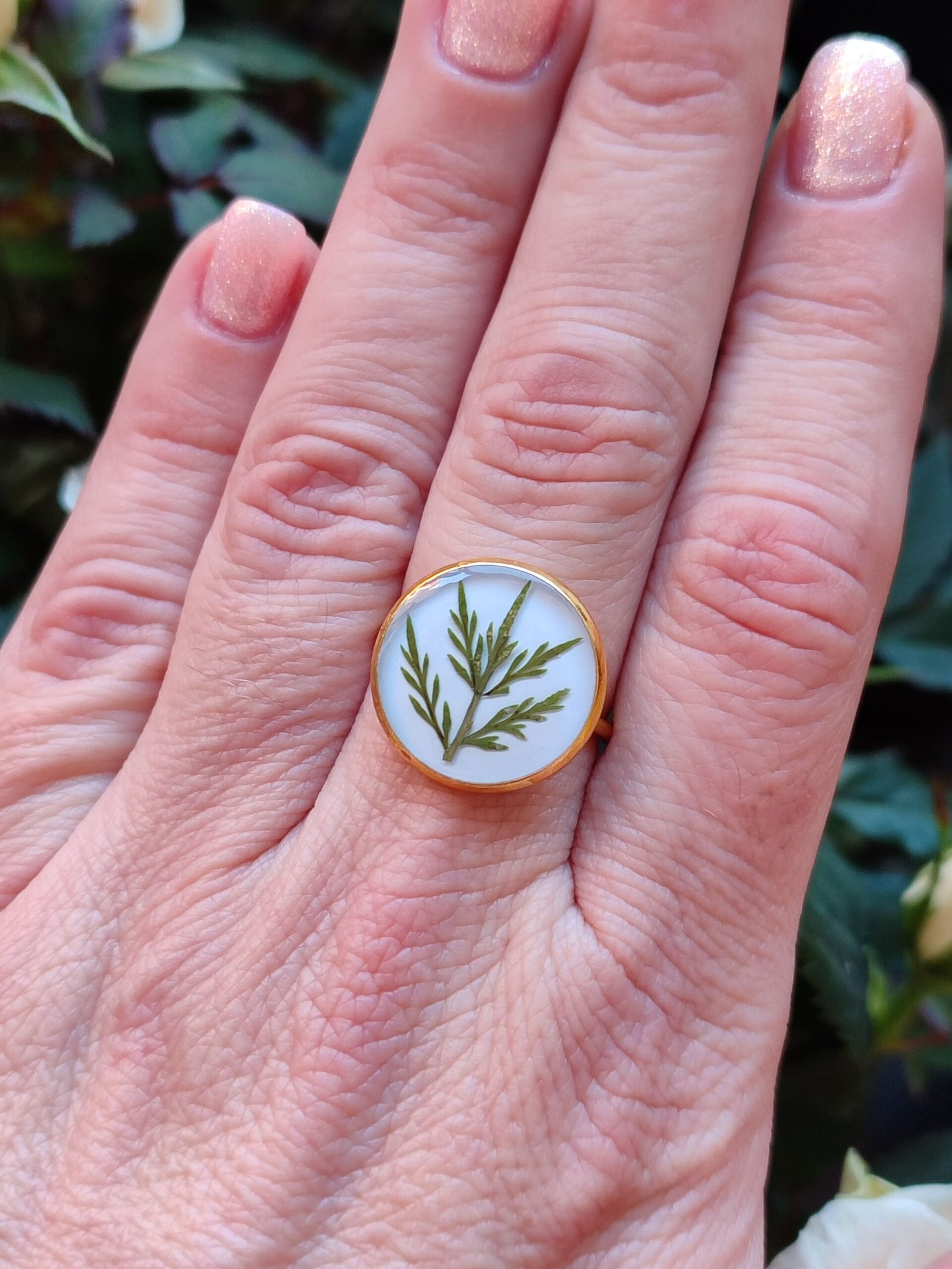 Anillo con base ajustable DORADA con UNAS HOJITAS SILVESTRES encapsuladas en resina.