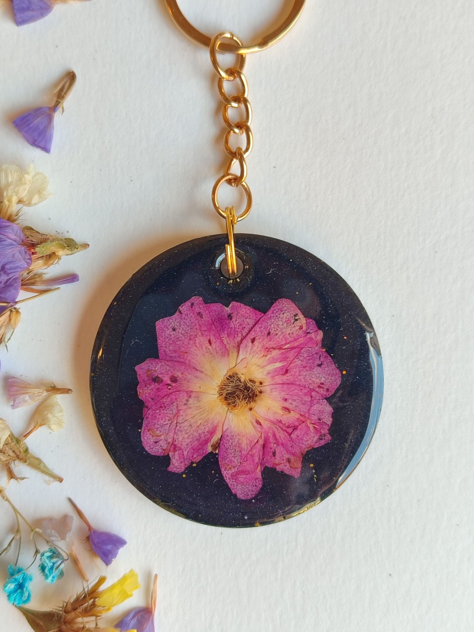 Llavero de Resina Epoxi con UNA ROSA LILA encapsulada en resina.