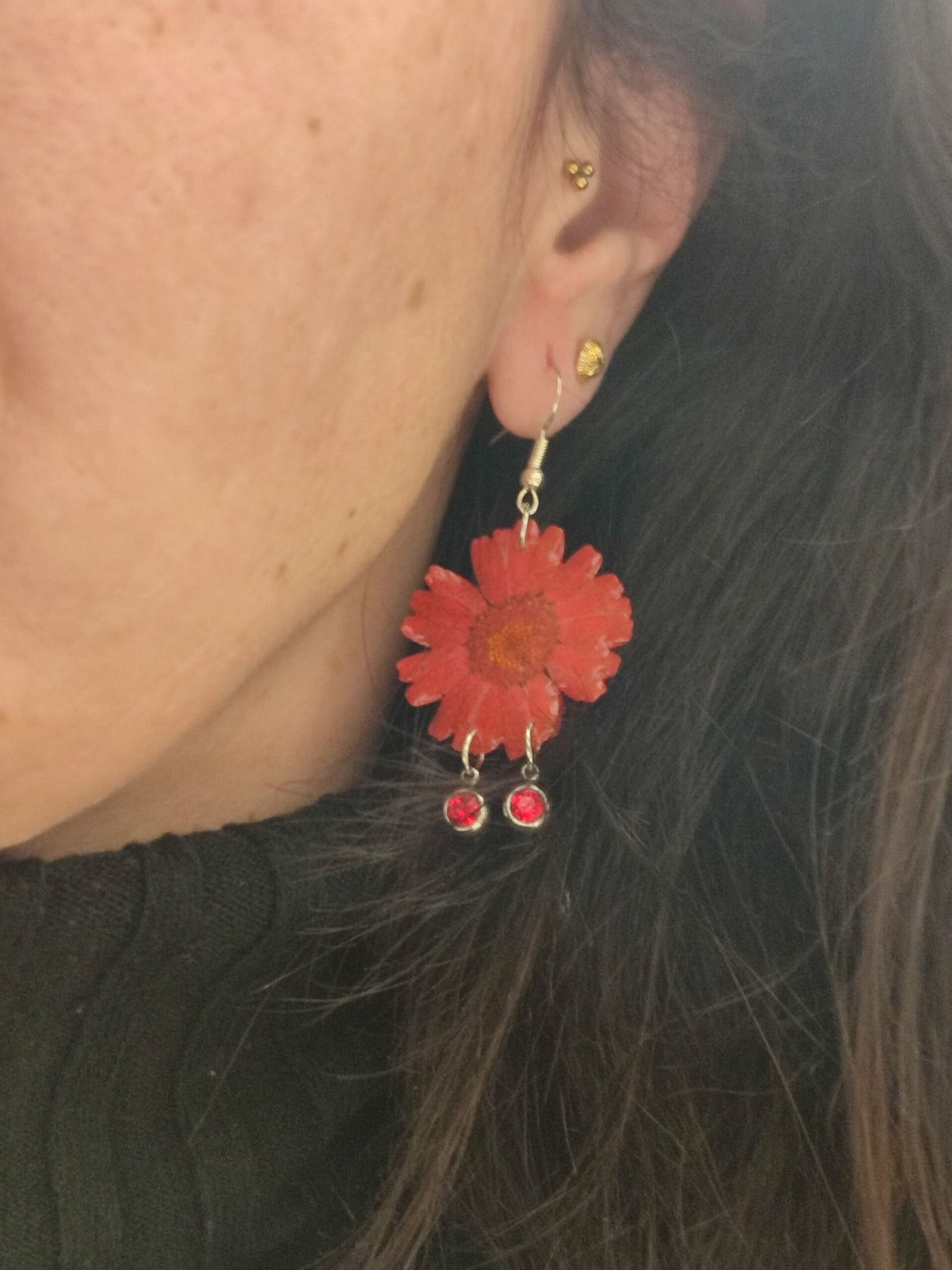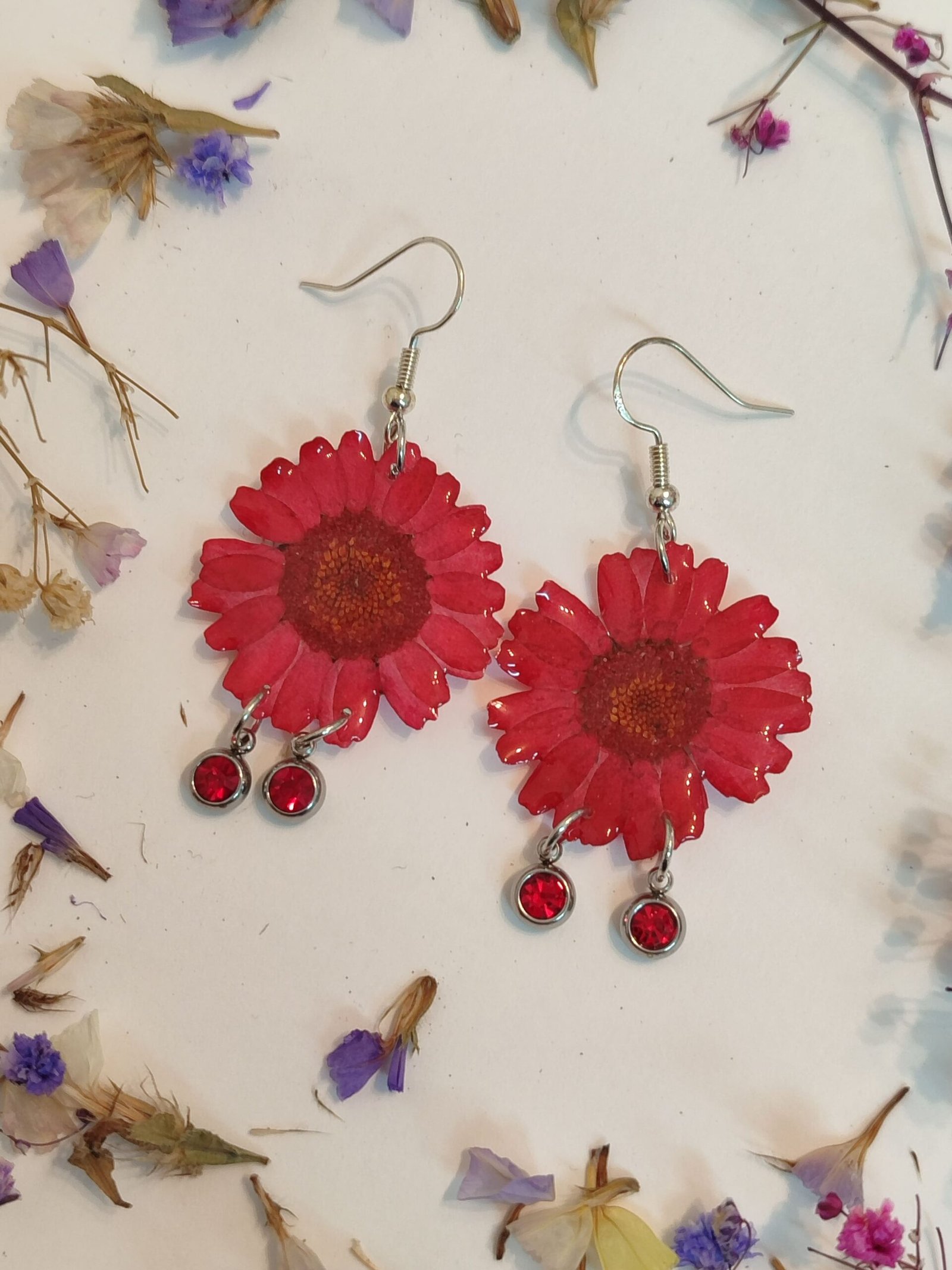 Pendientes con UNAS MARGARITAS ROJAS encapsuladas en resina.