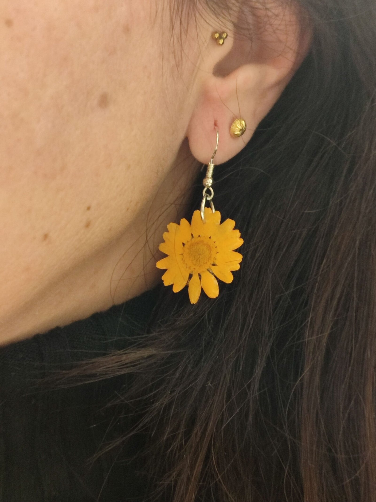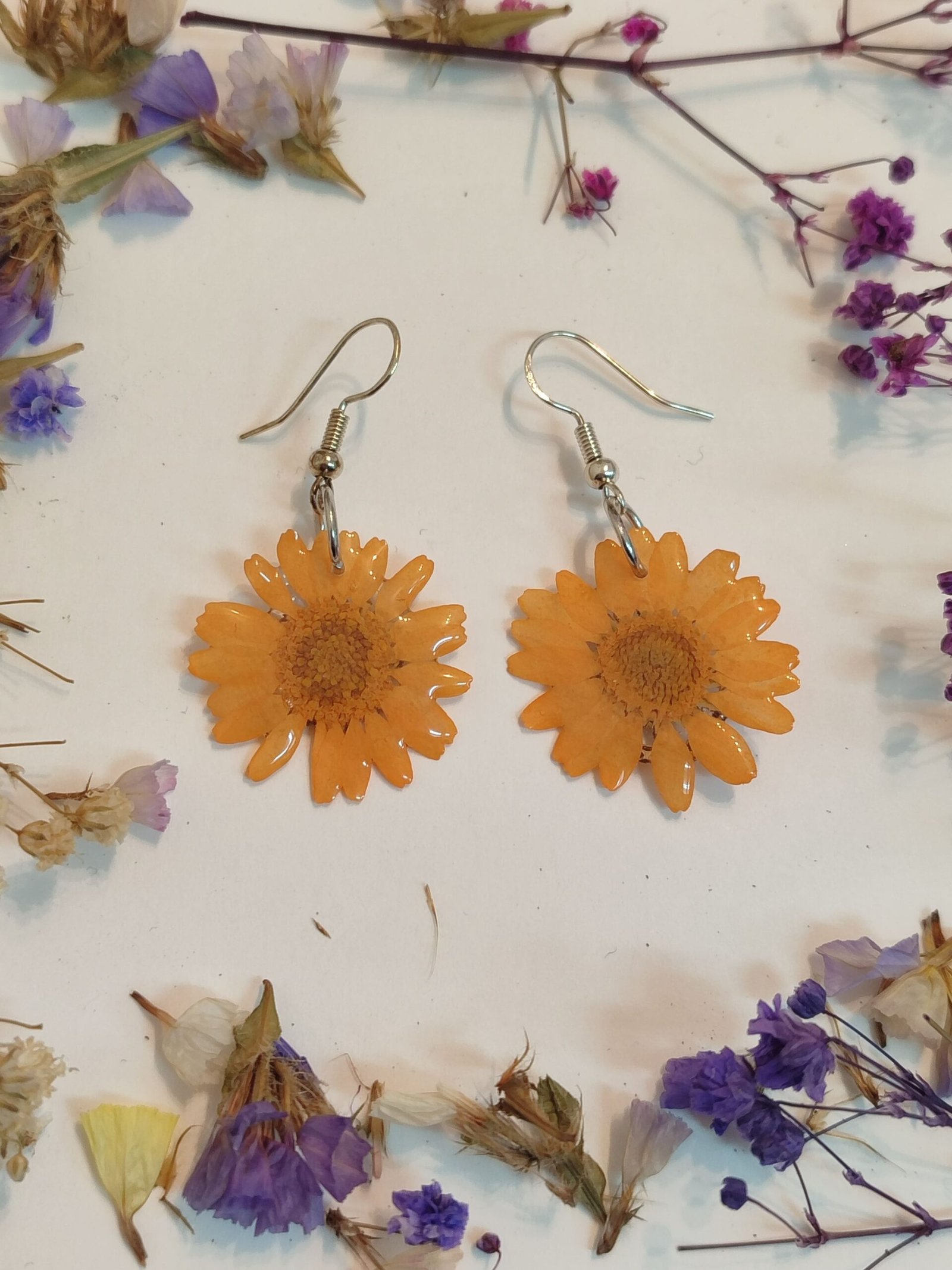 Pendientes con UNAS MARGARITAS NARANJAS encapsuladas en resina.