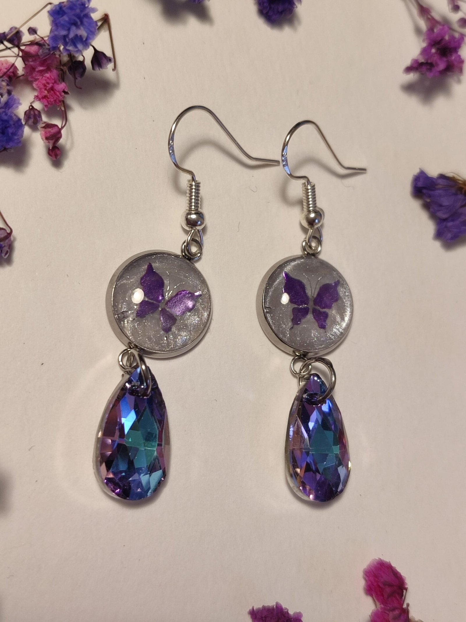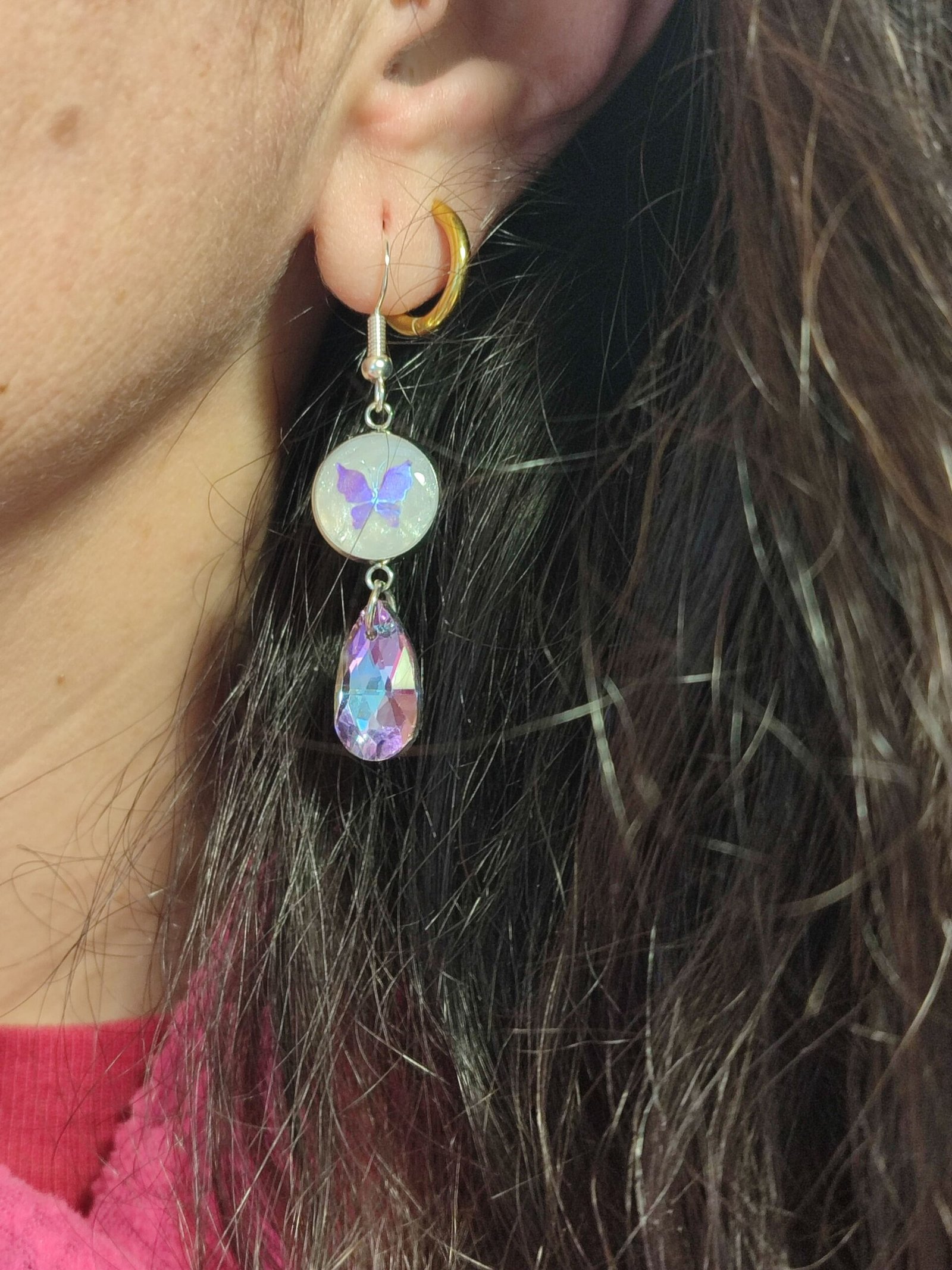 PENDIENTES con una MARIPOSA (pegatina) SOBRE FONDO BLANCO NACARADO y encapsulada en resina.