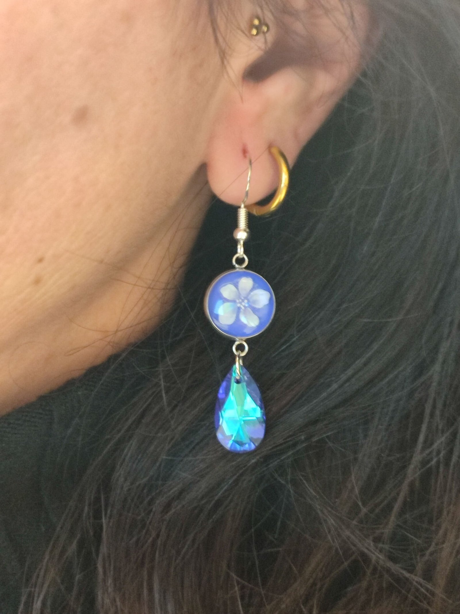 Pendientes con UNA FLOR BLANCA (PEGATINA) encapsulada en resina y una piedra HOLOGRÁFICA AZUL.
