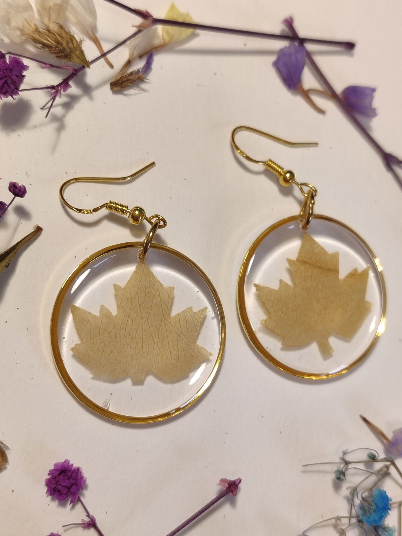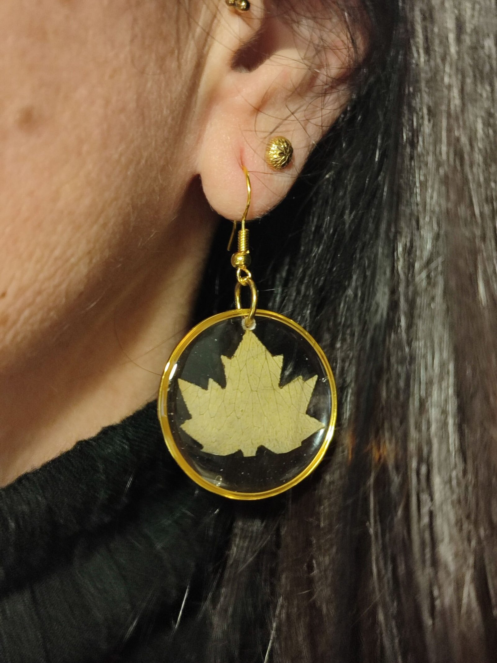 Pendientes con unas HOJAS REALES DE ÁRBOL TROQUELADAS EN FORMA DE HOJITAS y encapsuladas en resina.