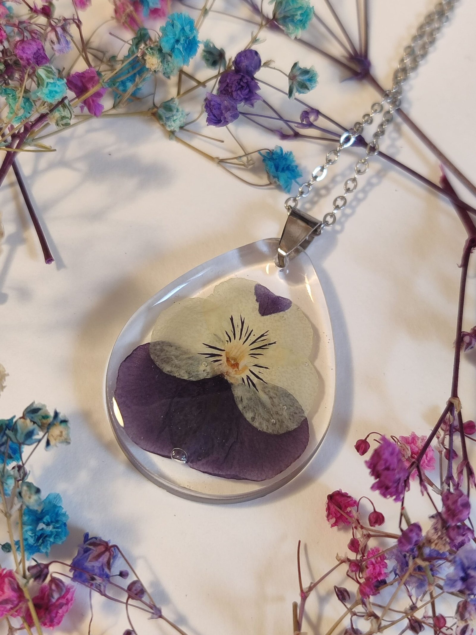 COLGANTE con UNA FLOR DE PENSAMIENTO encapsulada en resina.