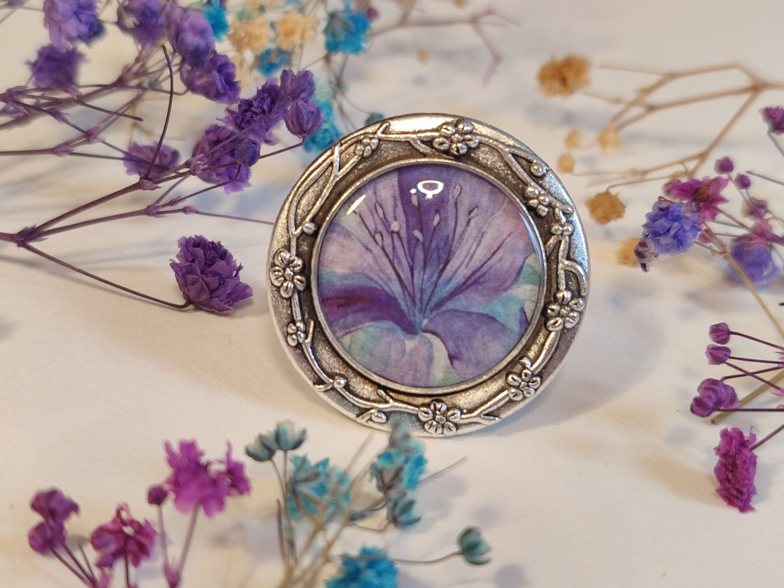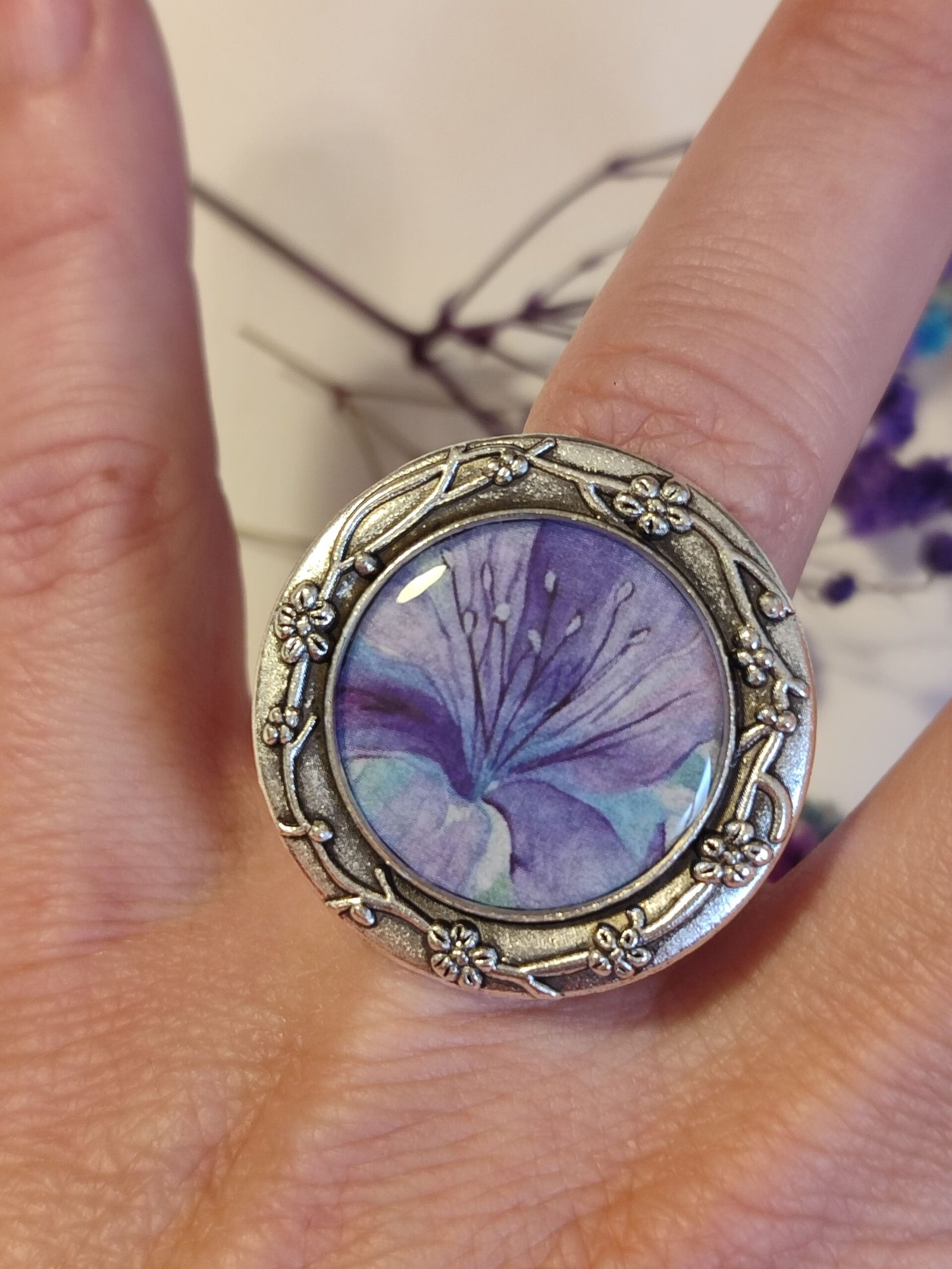 Anillo con base ajustable con UN PRINT CON ESTAMPADO FLORAL encapsulado en resina.