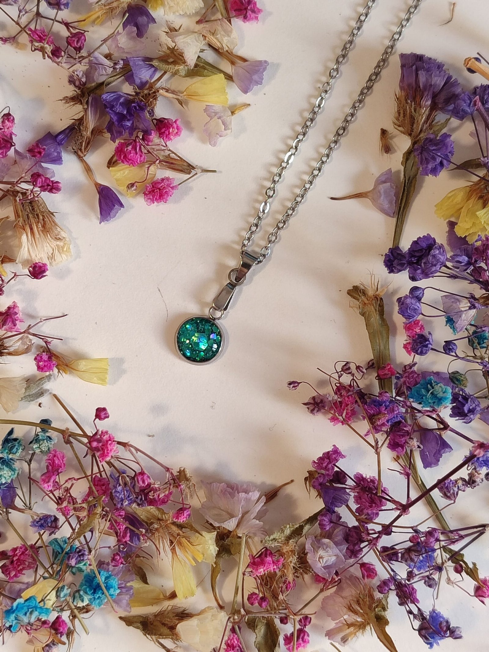 Colgante de acero inoxidable PURPURINA HOLOGRÁFICA encapsulada en resina.