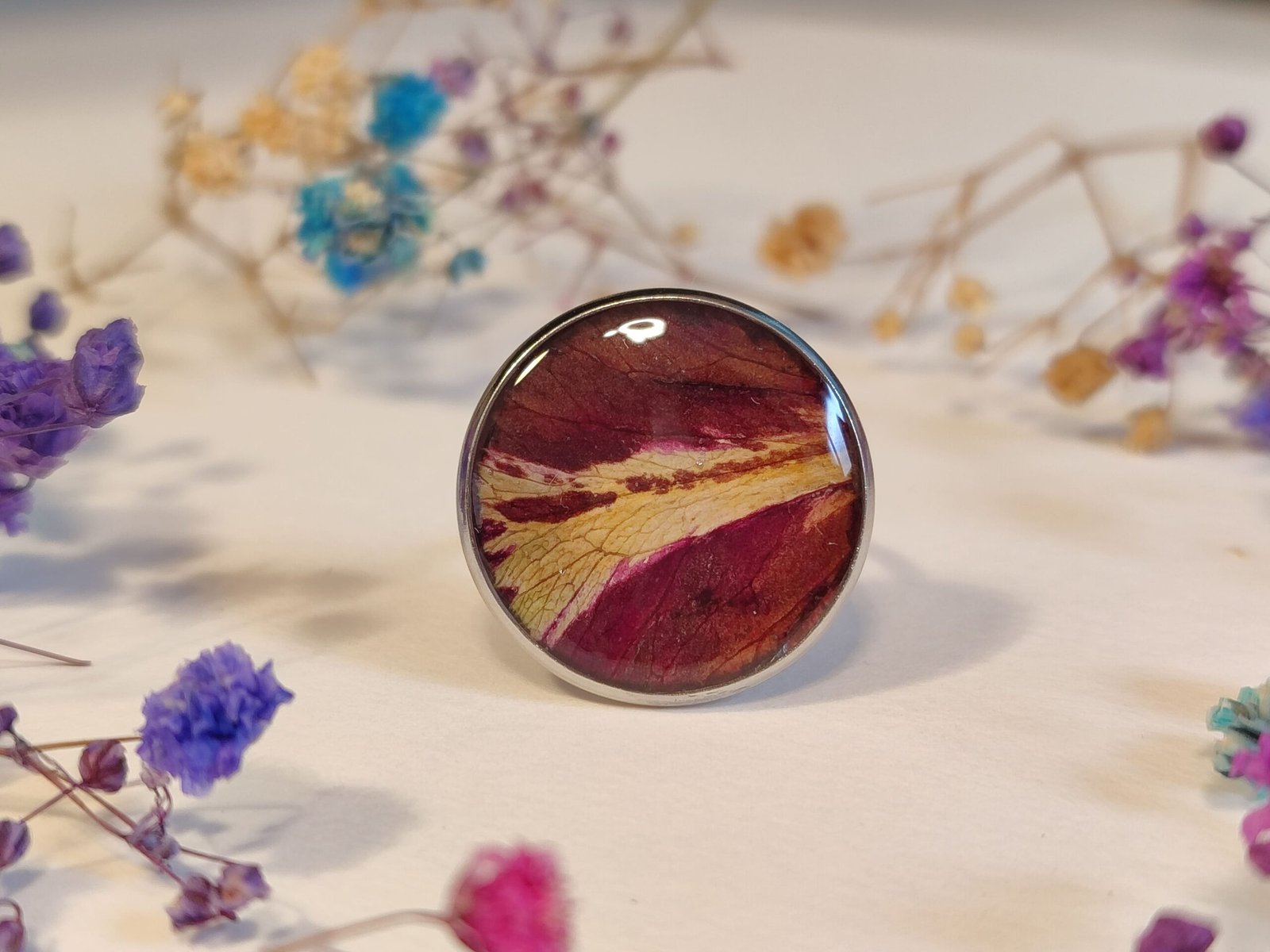 Anillo con base ajustable con UN PÉTALO DE ROSA encapsulado en resina.