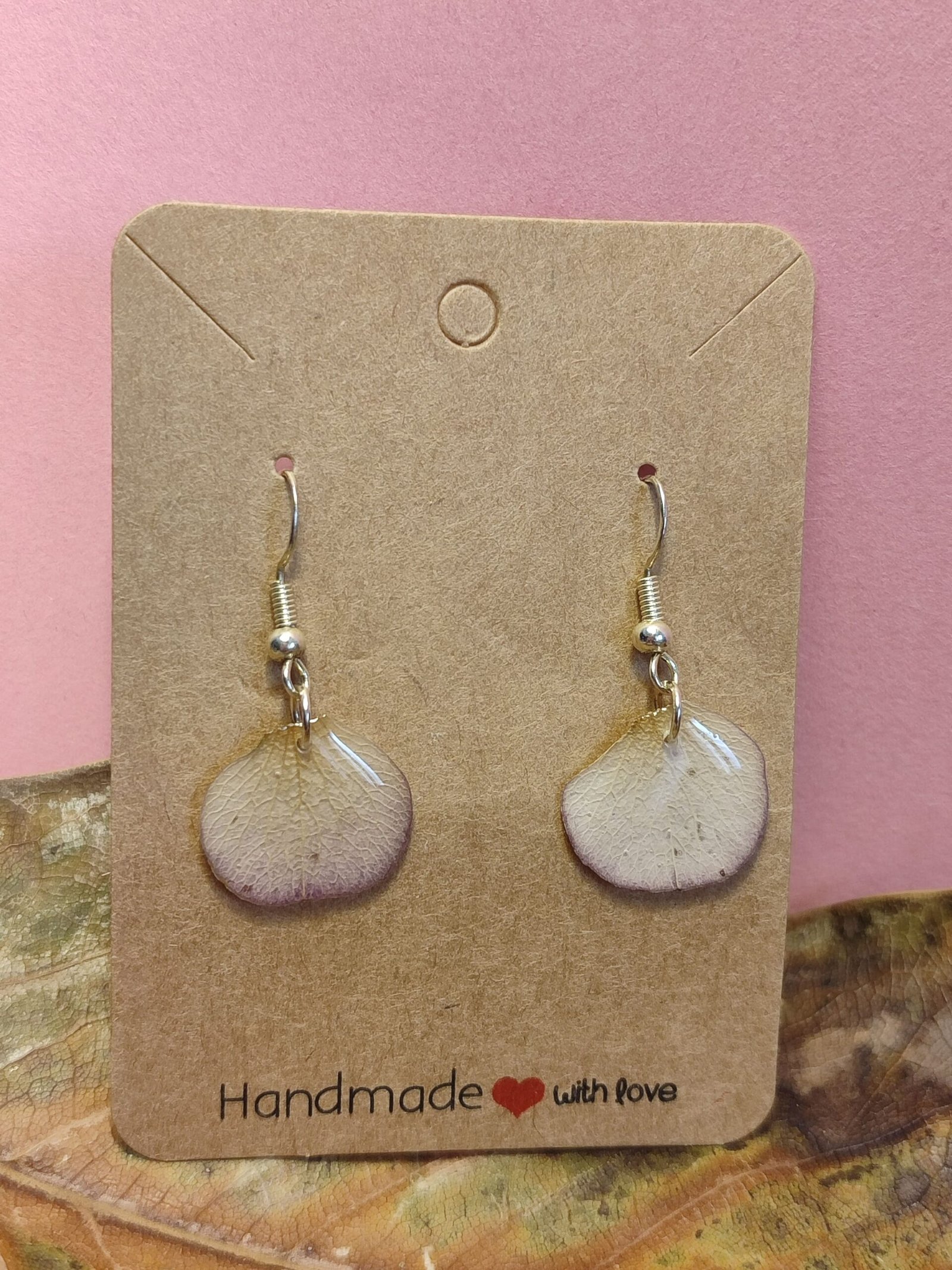 Pendientes con PÉTALOS DE HORTENSIA encapsulados en resina. Montados en gancho de acero inoxidable.