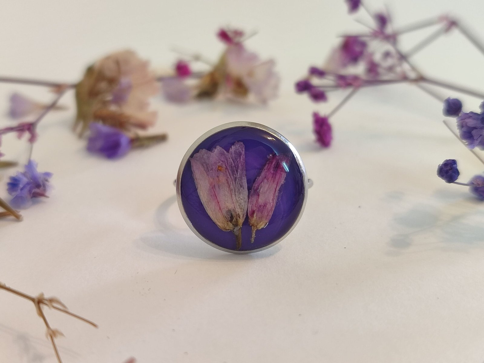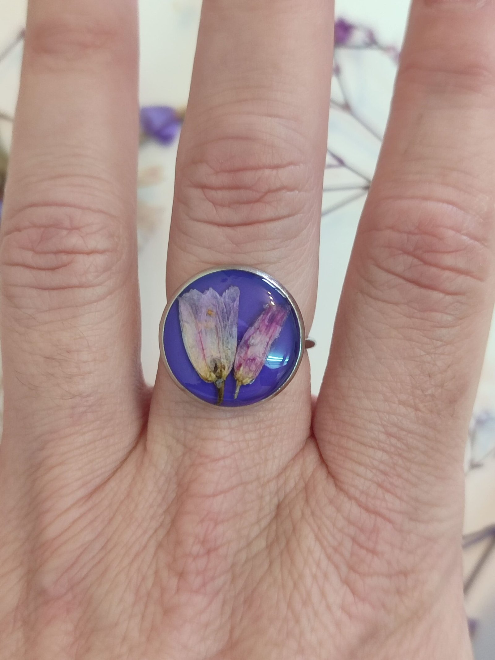 Anillo con base ajustable con FLORES SILVESTRES encapsuladas en resina.