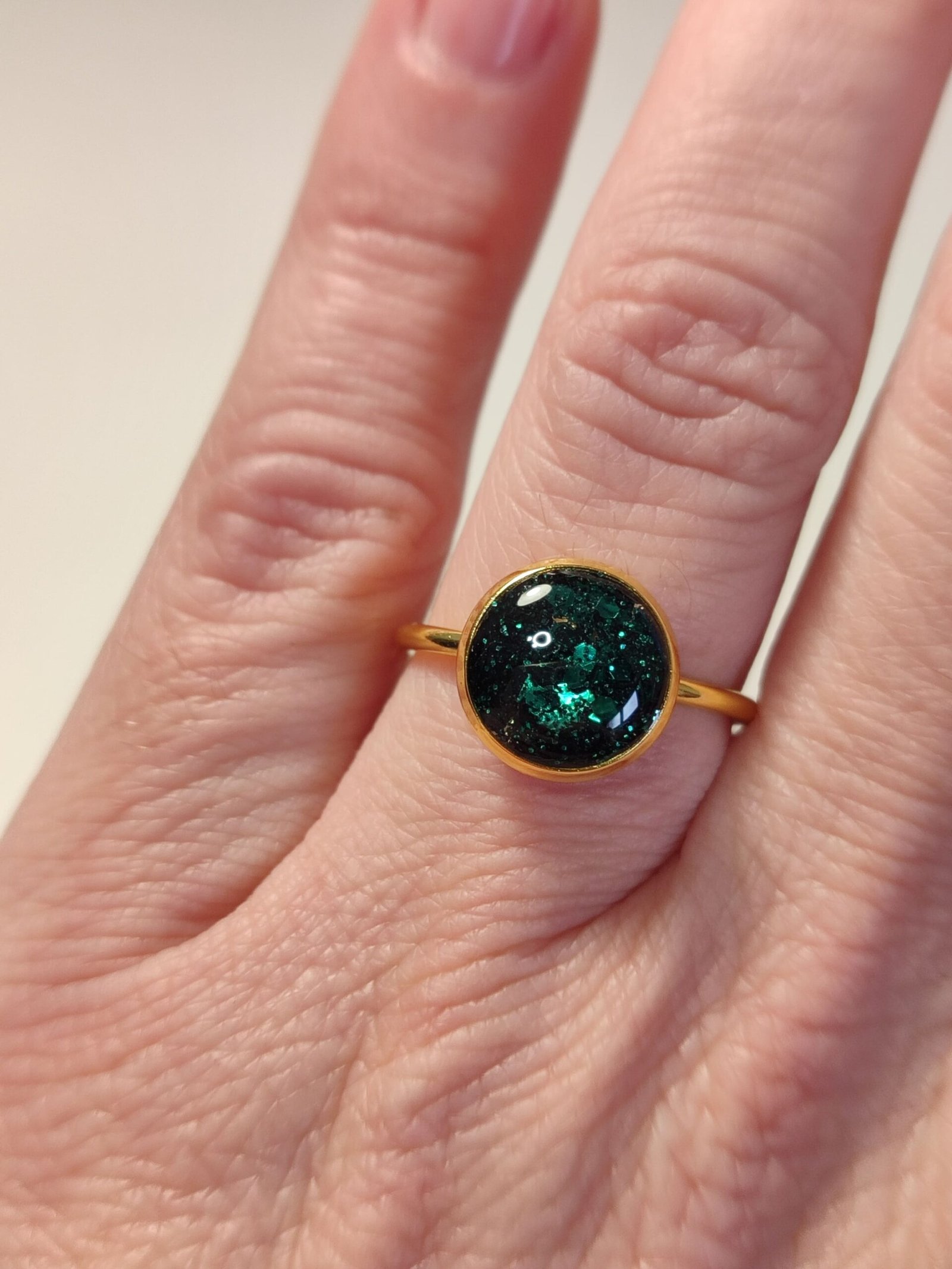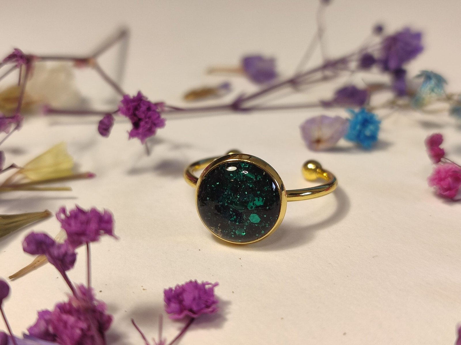 Anillo ajustable de acero inoxidable con PURPURINA HOLOGRÁFICA encapsulada en resina.