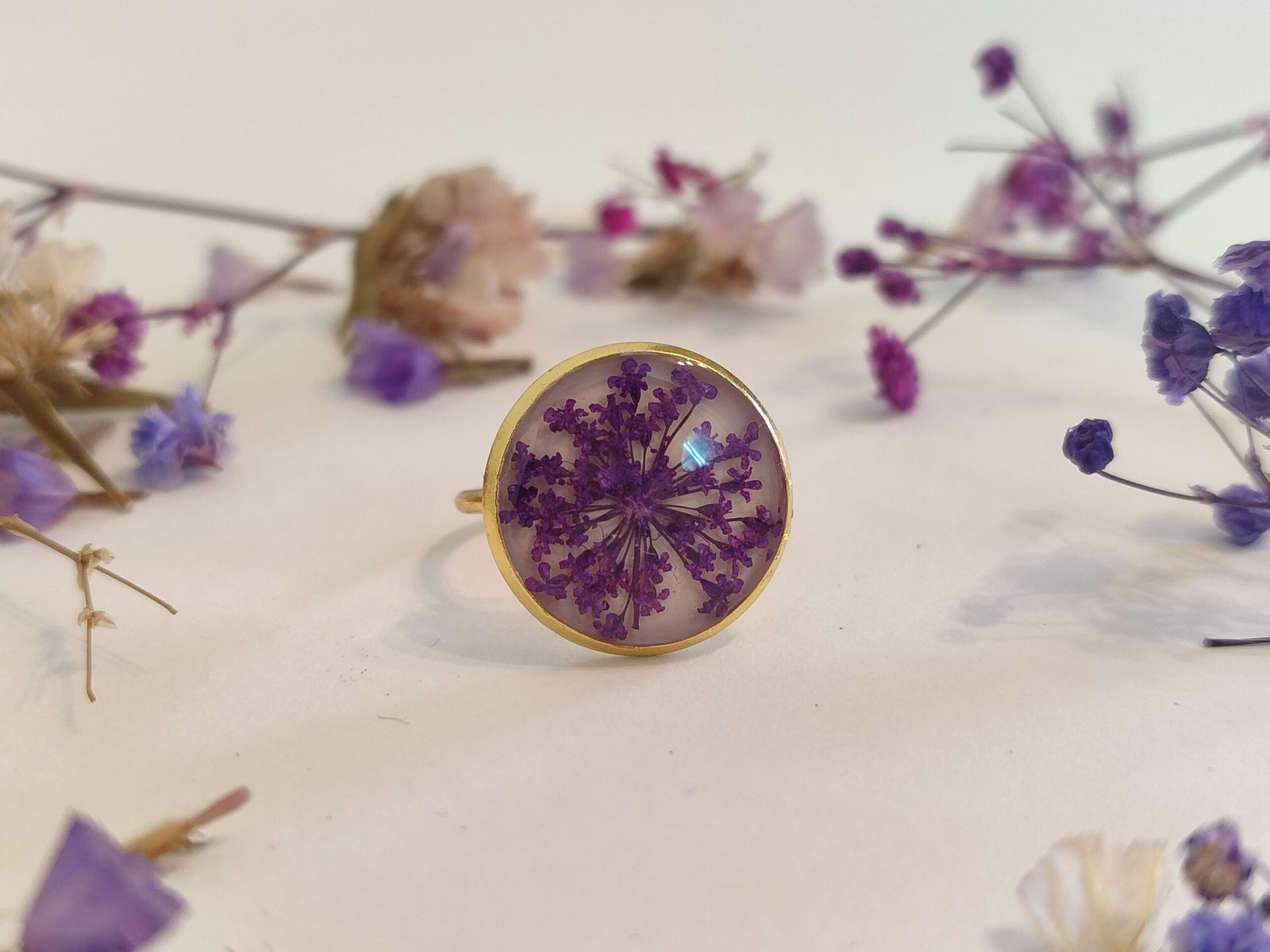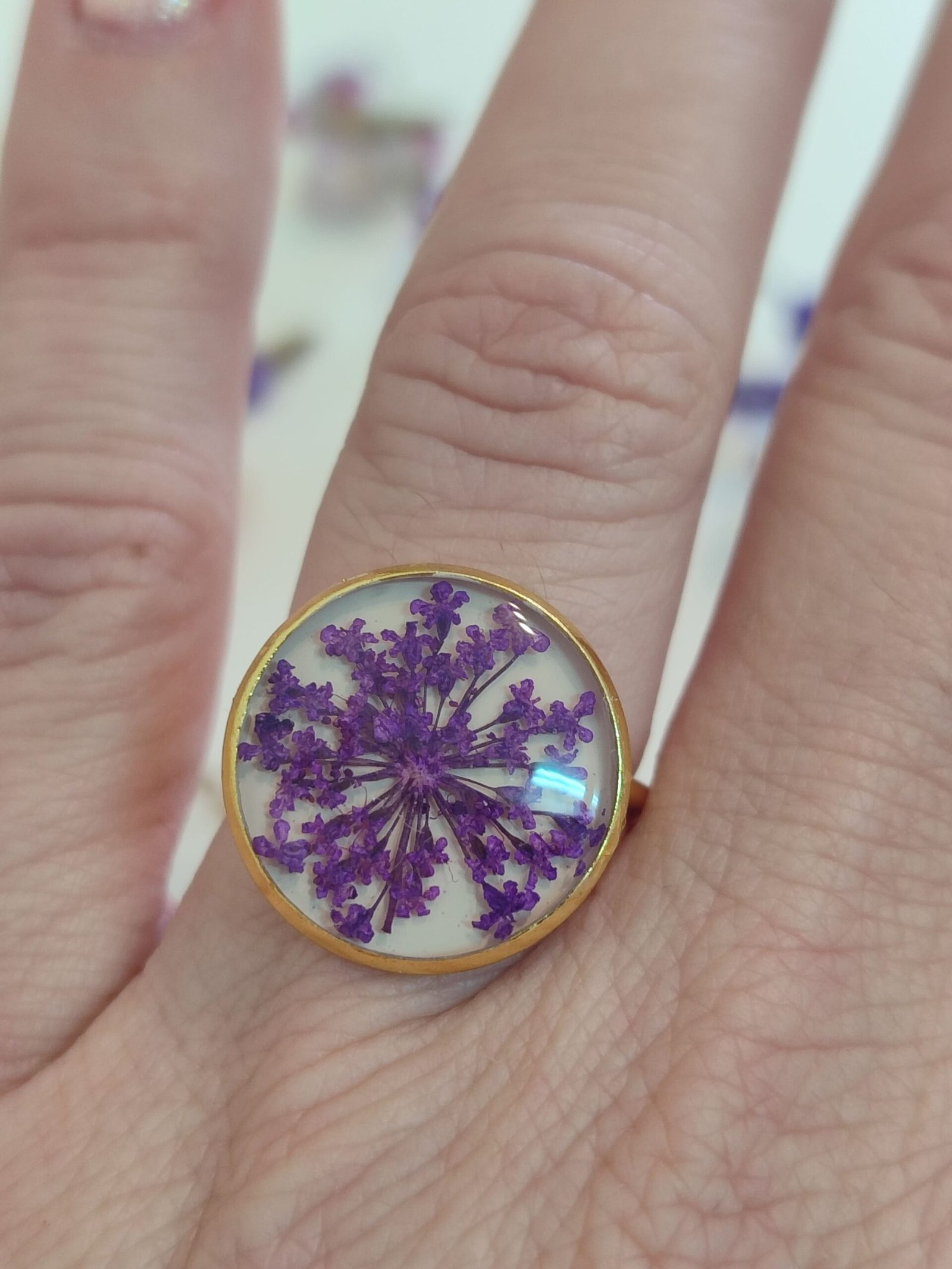 Anillo con base ajustable con FLORES DE ZANAHORIA SILVESTRE encapsuladas en resina.